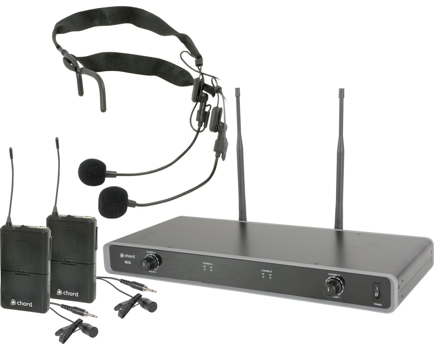 Dual wireless microphone system with fixed UHF receiver and 2 belt pack transmitters, supplied with a choice of neckband or lavalier microphones. The receiver unit is compatible with standard 19" racks using the included rack ears and front mounting antenna accessories.