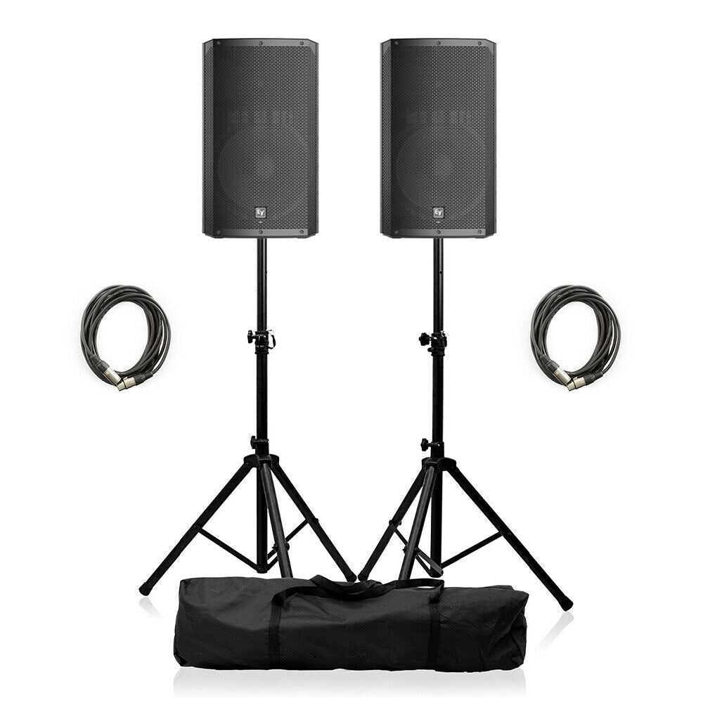 Dieses Paket enthält 2x Electrovoice ELX200-15P aktive 15" PA-Lautsprecher, 1x NJS NJS063DE Lautsprecherständer-Kit (2x Ständer mit Tasche) und 2x XLR-Kabel.