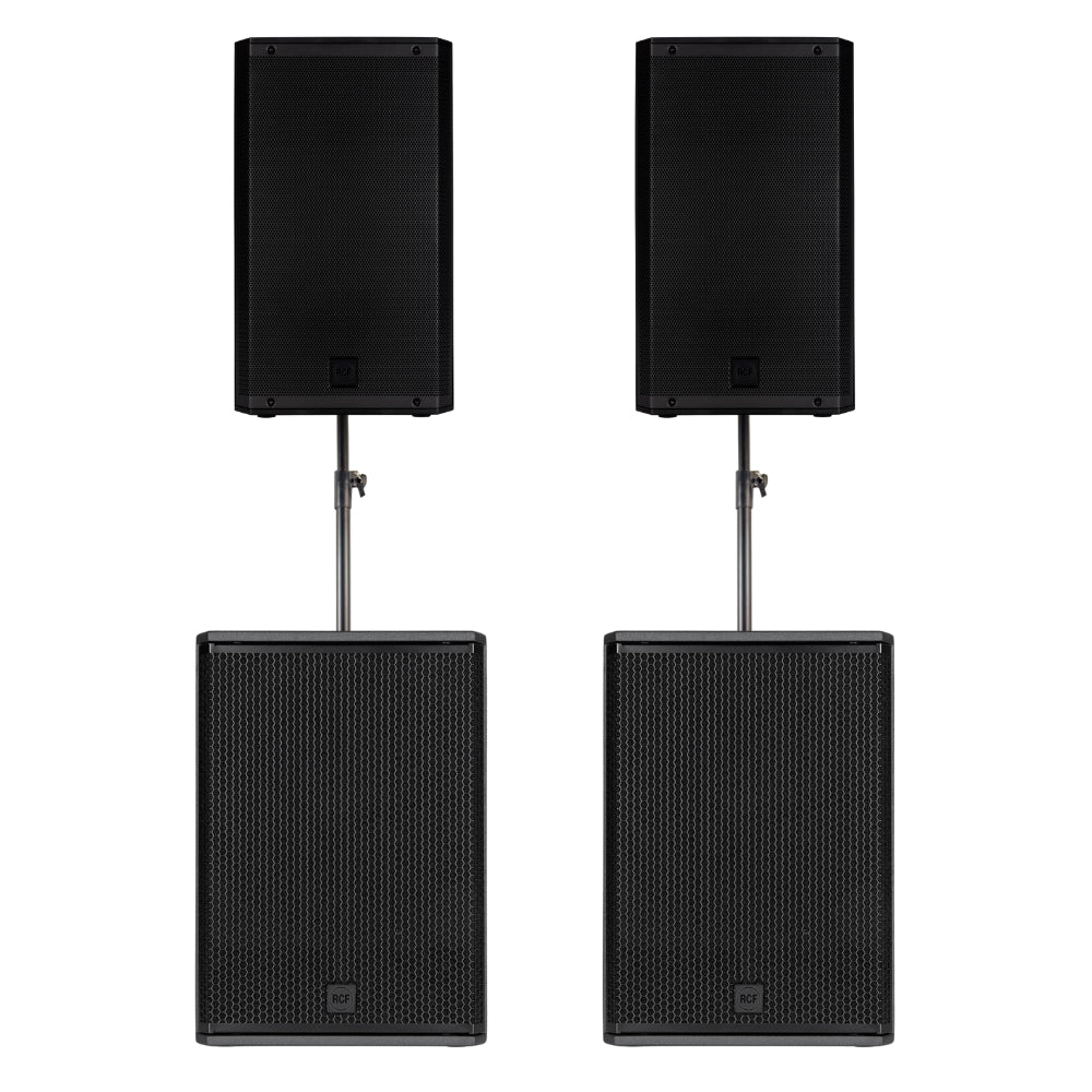 This bundle includes 2x RCF SUB 15-AX 15" active speaker 2100W with 2x ART915-AX 15" subwoofer 2200w and mounting poles
