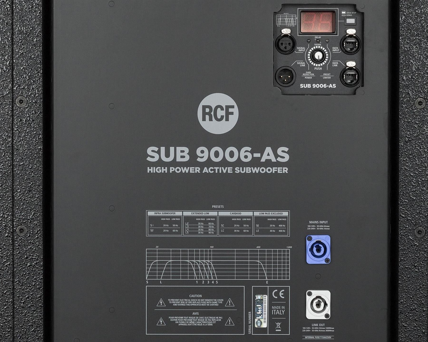 The amplifier integrates a low-noise 32-bit DSP circuit, controlled through the RCF proprietary RDNet network to easily handle the soft clipping limiters, RMS limits, polarity, amplitude, timing and equalisation. All the settings, monitoring and advanced features are available inside the RDNet Networked Management software. The available control panel on the back adjusts input sensitivity, Low Cut, Xover, volume, bypass, delay and presets selection. The regulated power supply guarantees full power from 100 V to 260 V. The amplifier houses on a unique Vibrostop floating aluminium panel for extra protection during transportation.