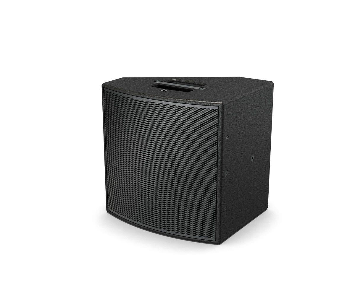 Companion AMS115 multipurpose subwoofer also available — 15-inch transducer, low frequency down to 35 Hz, 130 dB peak output, 28 kg (63 lb) design with integrated M20 threaded pole mount and 12 M10 threaded inserts for suspension in permanent installations