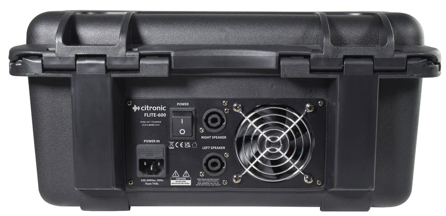 The FLITE-600 is a fully self-contained 2 x 300W PA system built into a rugged moulded flight case, combining a high-performance mixer, dual wireless microphone system, and advanced audio playback features. Designed for mobile entertainers, schools, fitness instructors, and live performers, this compact powerhouse delivers professional sound with exceptional versatility. The 4-channel mixer section includes Bluetooth and USB playback with dedicated volume controls, while the built-in UHF microphone receiver supports two handheld mics stored neatly within the case. With 99 adjustable DSP effects and phantom power, the FLITE-600 offers studio-grade audio control in a road-ready design.