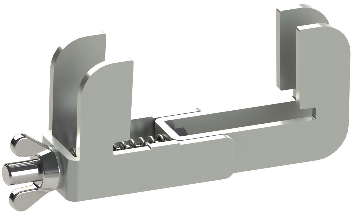 Eine Klammer, um benachbarte Bühnenbelagsstücke aneinander zu befestigen. Teil des modularen Bühnensystems aus Aluminium. Wird unter dem Bühnenbelag befestigt und sorgt so für eine starke und dennoch unauffällige Verbindung. Handfest mit Flügelmutter und Schraube.