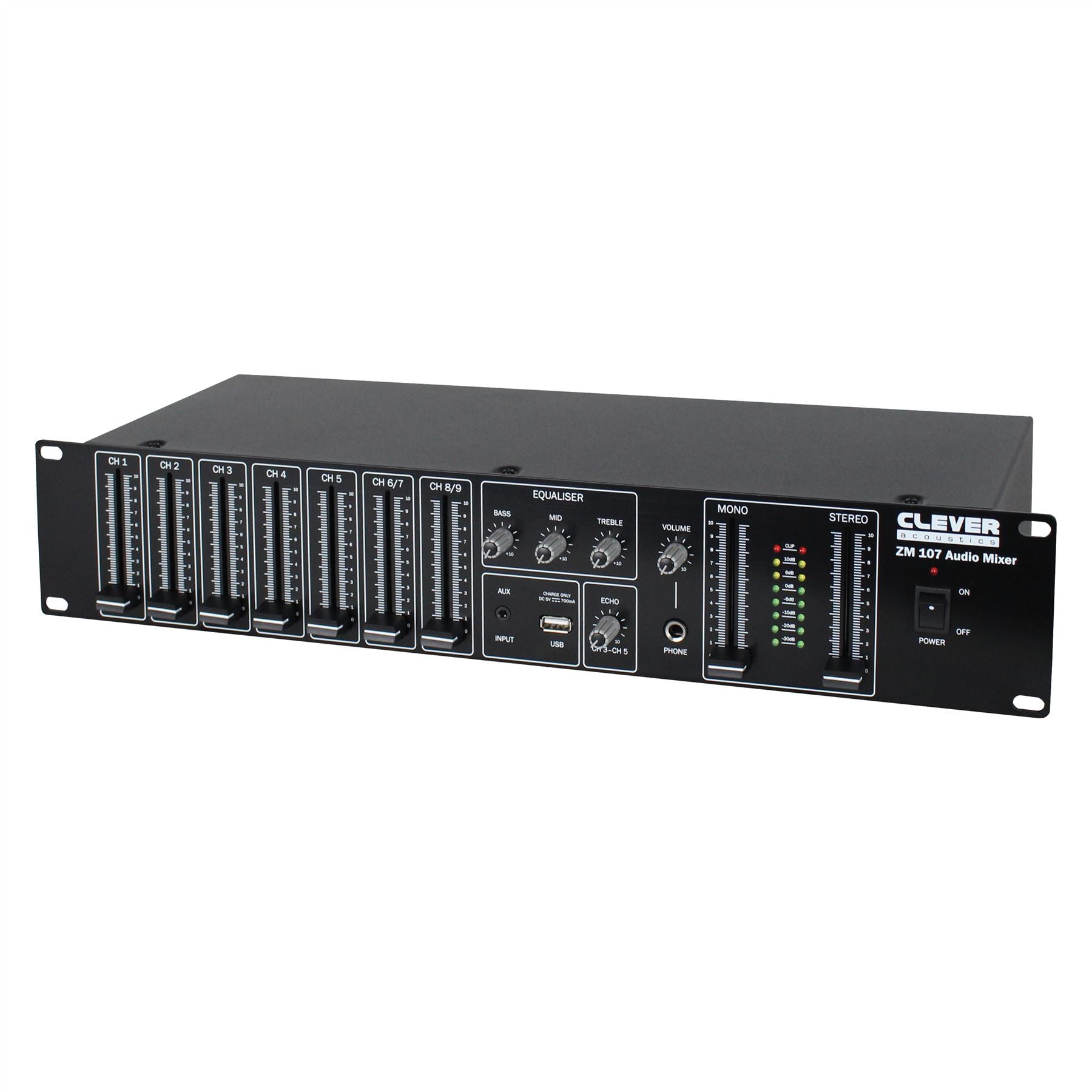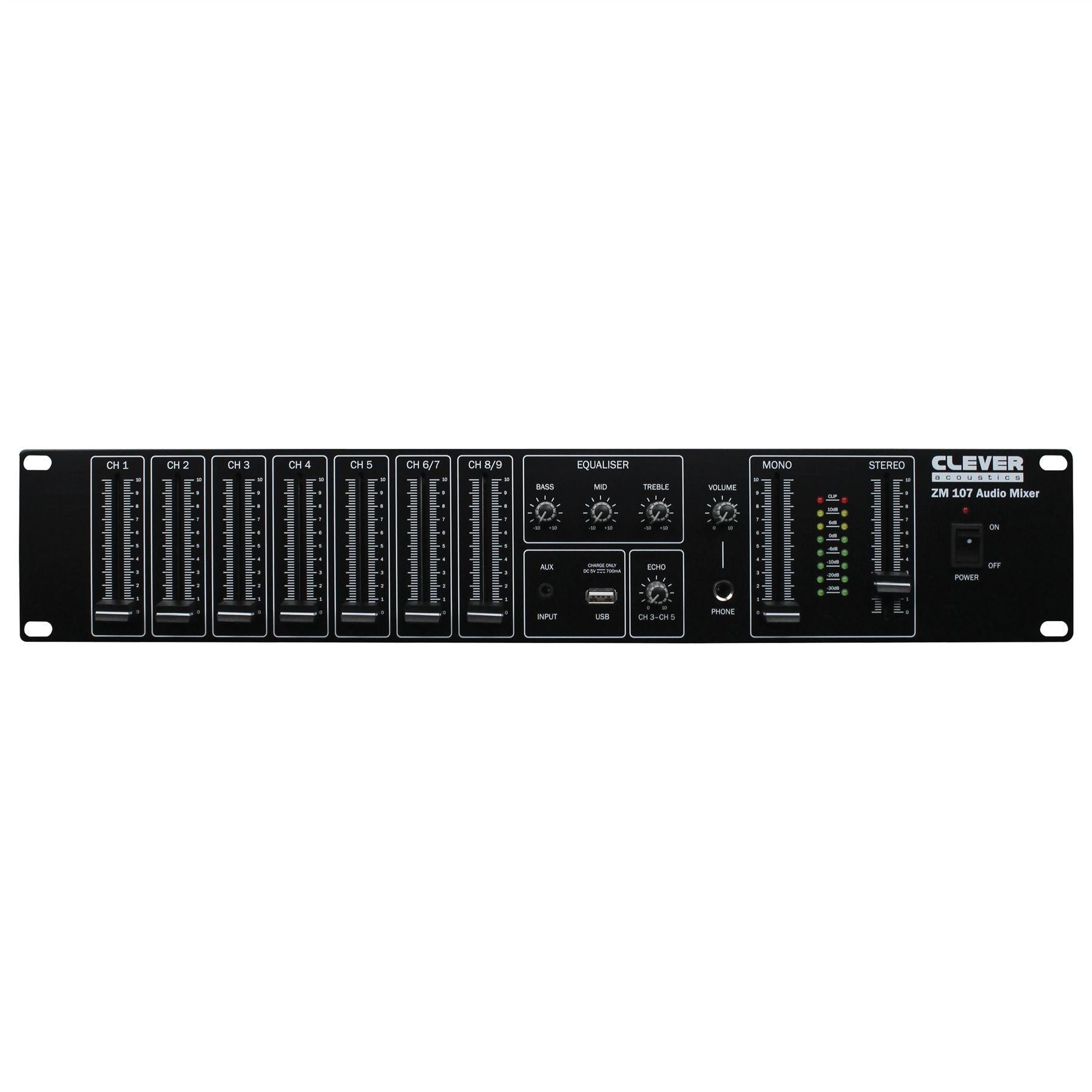 Dieser 2U-Mixer eignet sich perfekt für Beschallungs- und Hintergrundmusiksysteme, bei denen mehrere Eingänge erforderlich sind. Der ZM 107 eignet sich für den Einsatz in einer Vielzahl von Veranstaltungsorten und bietet dem Benutzer eine intuitive Bedienoberfläche mit sieben 60-mm-Fadern, während er gleichzeitig eine große Anzahl von Funktionen für komplexe Audiosysteme beibehält. Der Mixer ZM 107 verfügt über 7 Eingangskanäle mit jeweils einstellbaren Lautstärkereglern. Fünf dieser Kanäle sind Mikrofoneingänge mit XLR/6,3-mm-Kombibuchsen, die anderen beiden Kanäle sind RCA-Stereoeingänge mit Line-Pegel. Zusätzlich zu den Funktionen verfügt der ZM 107 über einen 3-Band-EQ, Mono-Ausgang, Echo und einen an der Vorderseite montierten AUX-Eingang, ideal für MP3-Player.