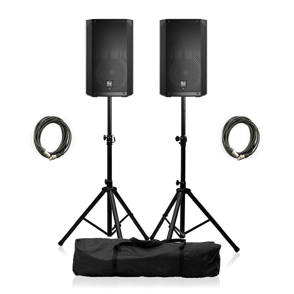 Dieses Paket enthält 2x ElectroVoice ELX200-10P aktive 10''-Lautsprecher, 1x NJS NJS063DE Lautsprecherständer-Kit (2x Ständer mit Tasche) und 2x XLR-Kabel.