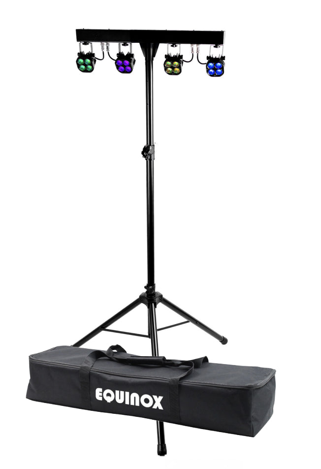The compact, all-in-one Equinox MicroPar Bar Quad System includes a robust stand, road bag, IR remote and 4 multi-colour LED Pars fitted to a powered T-bar. The 4 LED Par panels are of a micro size and each feature 4 x 5W quad-colour LEDs that can flash to the music or change colour independently unlike many inferior bar systems. The user has control over colour, auto, sound active and DMX modes, via the LED display and buttons. The IR remote gives instant and simple control over several control modes.