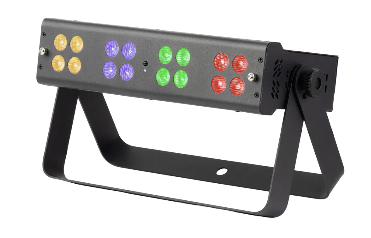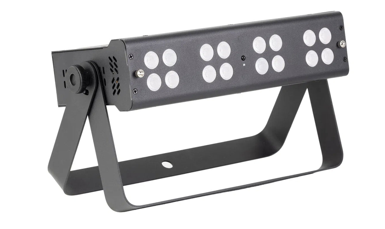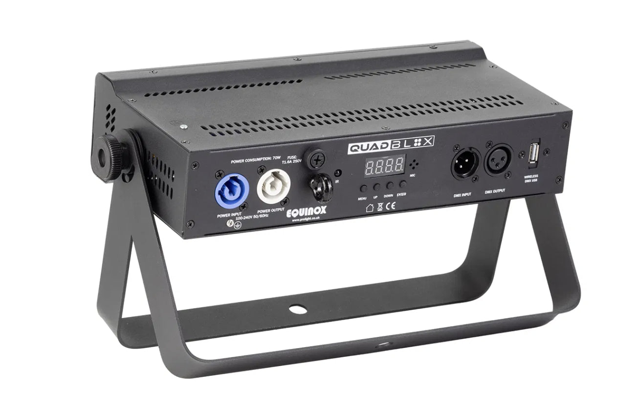 Packed with sixteen 4W RGBWW LEDs, the Equinox Quad Blox delivers bold, vibrant colour with seamless blending and a removable frost filter for smooth washes. It features a variety of built-in shows accessible via the onboard menu or an included IR remote, facilitating straightforward plug-and-play operation. For advanced users, multiple DMX modes provide individual control over each segment, and the unit is compatible with W-DMX USB for wireless connectivity. The Quad Blox comes equipped with a dual bracket, allowing for flexible rigging or floor-standing setups.