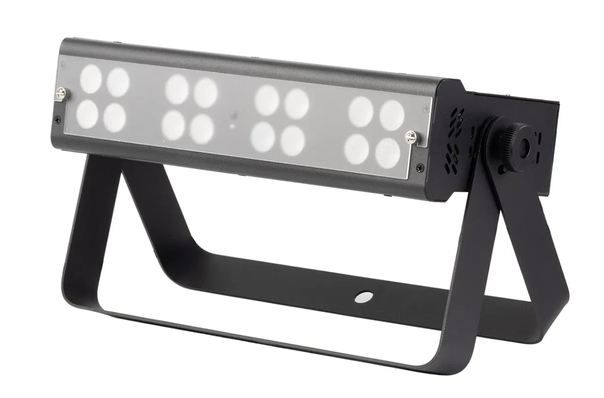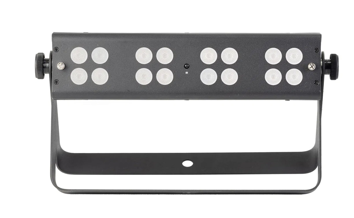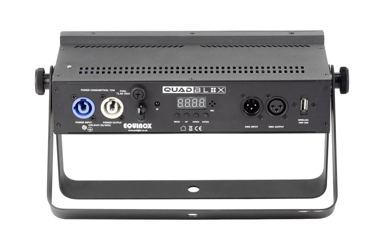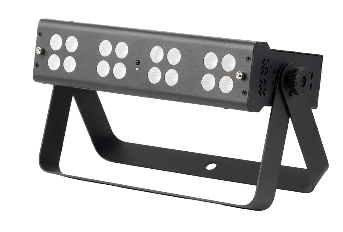 Packed with sixteen 4W RGBWW LEDs, the Equinox Quad Blox delivers bold, vibrant colour with seamless blending and a removable frost filter for smooth washes. It features a variety of built-in shows accessible via the onboard menu or an included IR remote, facilitating straightforward plug-and-play operation. For advanced users, multiple DMX modes provide individual control over each segment, and the unit is compatible with W-DMX USB for wireless connectivity. The Quad Blox comes equipped with a dual bracket, allowing for flexible rigging or floor-standing setups.