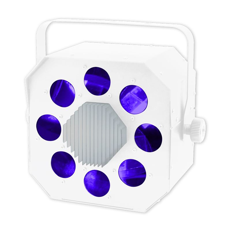 Diese Hochleistungs-Moonflower wird von einer 60-W-Osram-Ostar-Vierfarben-RGBW-LED angetrieben. Der Hightech-Shard erzeugt eine intensive Farbpalette kombiniert mit gestochen scharfen Strahlen. Mehrere integrierte Shows ermöglichen es dem Benutzer, schnelle, energische Bewegungen und Farbwechsel oder eine langsame, konstante Rotation auszuwählen, um einen Spiegelkugeleffekt zu emulieren.