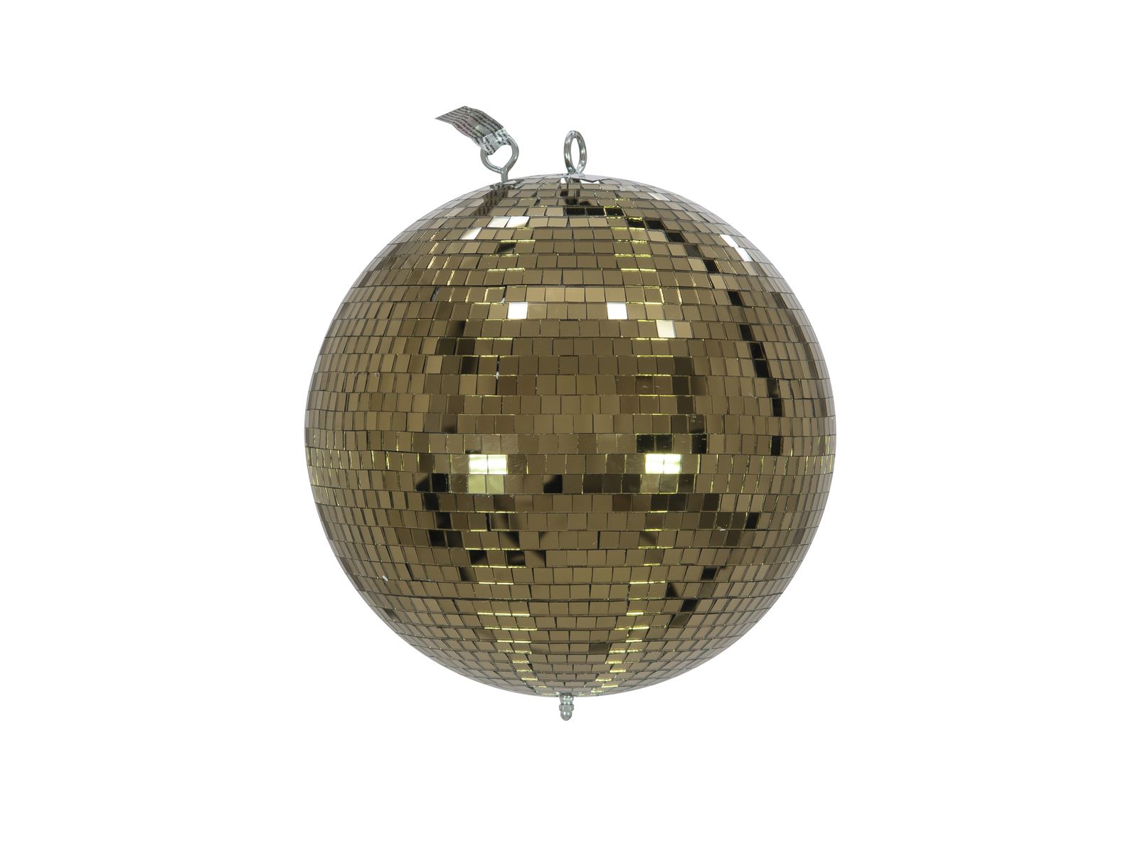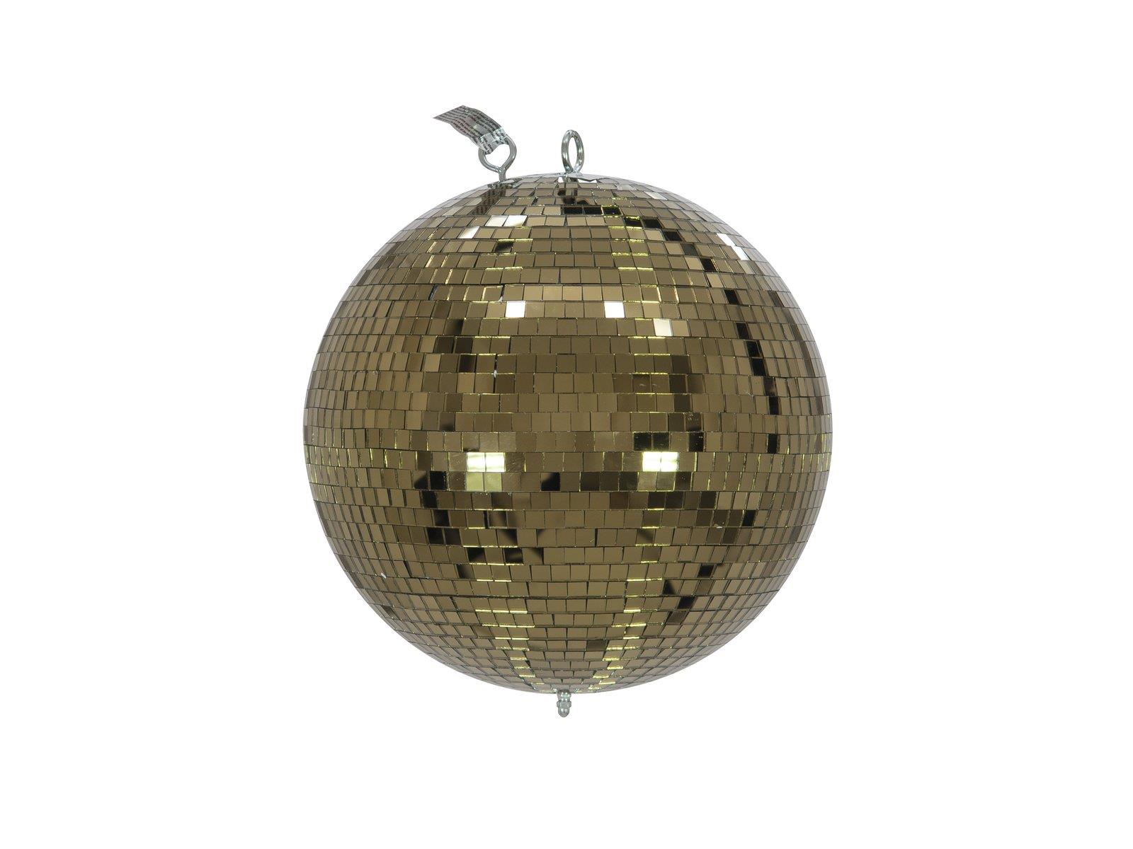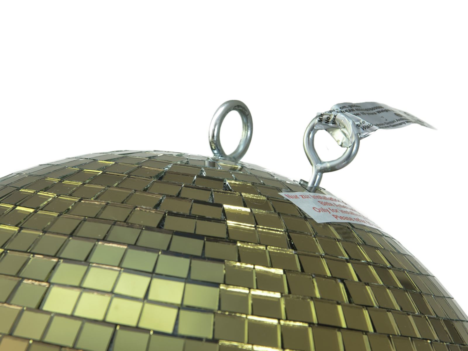 Dieses Modell in Profiqualität hat einen Durchmesser von 30 cm und ist mit unzähligen kleinen goldfarbenen Spiegeln (10 x 10 mm) überzogen. Der robuste Kunststoffkern ist mit Hunderten kleiner Spiegelfacetten bedeckt und verfügt über einen durchgehenden Schaft, der eine hohe Zugfestigkeit garantiert. Die Spiegelkugel verfügt außerdem über zwei Ösen, an denen sowohl die Befestigungskette als auch die erforderliche Absturzsicherung befestigt werden können.
