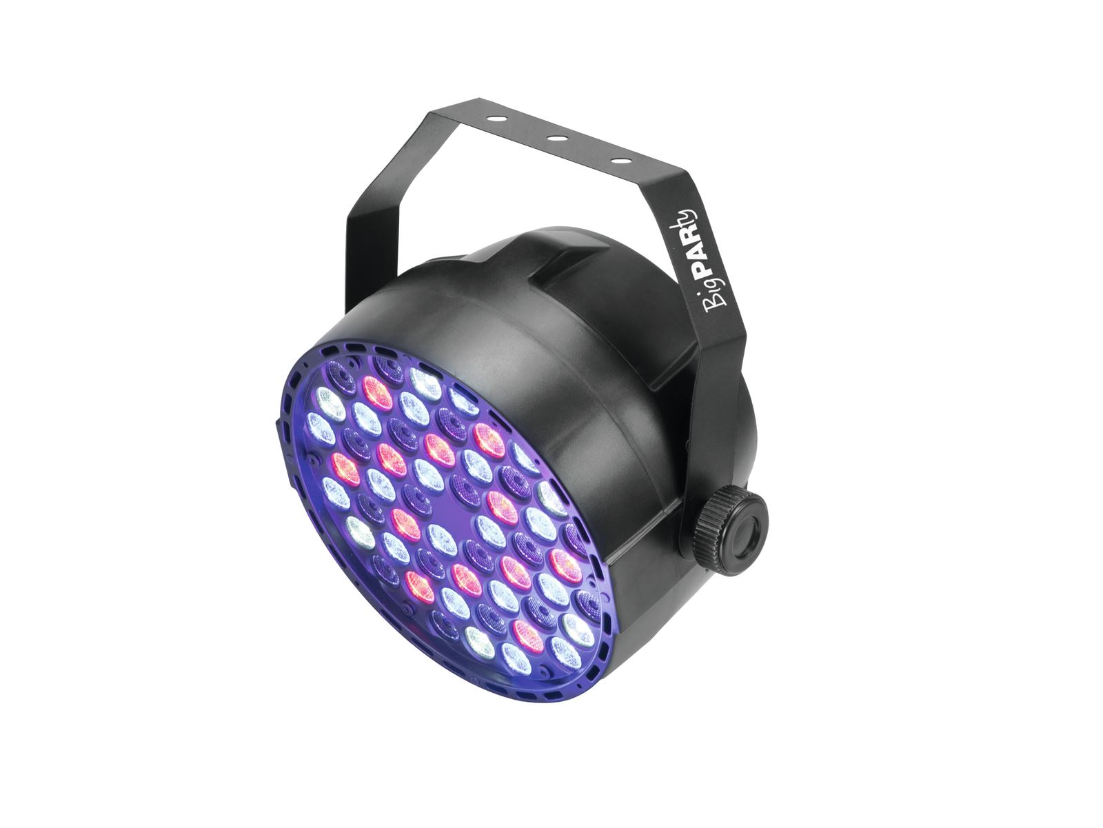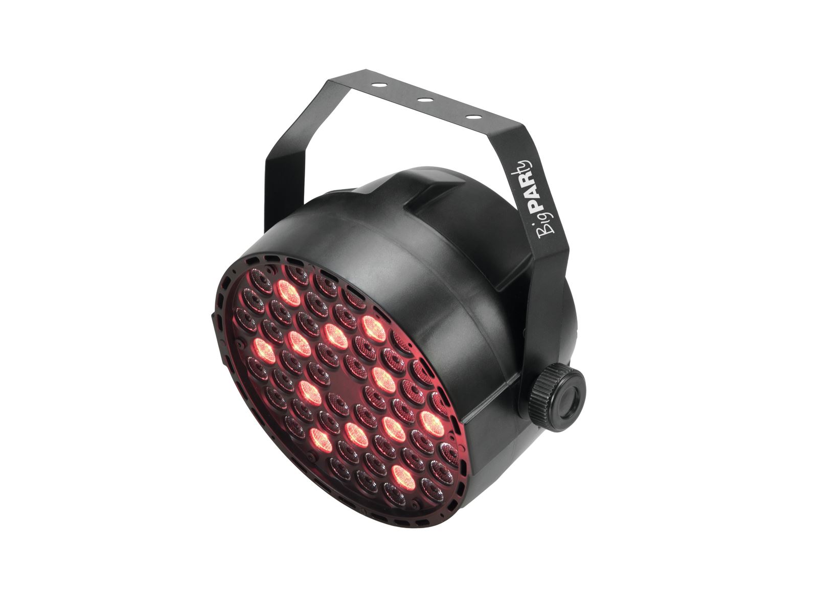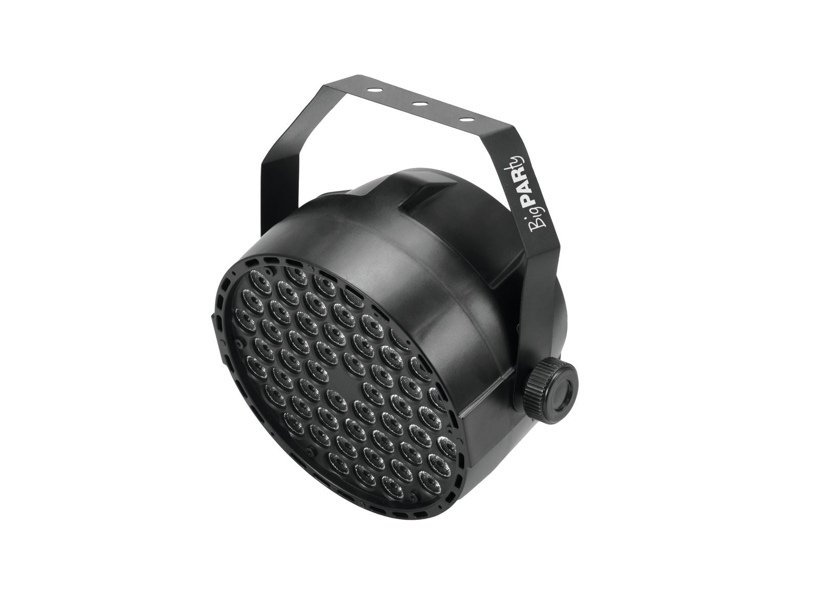 Großer PerformerTolle Effekte für tolle Partys: Dieser LED-Spot von Eurolite ist mit insgesamt 54(!) LEDs ausgestattet, die für tolle Lichteffekte sorgen.Starke LEDs in leuchtenden FarbenHochleistungs-LEDs in den Farben Rot, Grün, Blau und Weiß erhellen den Raum jede Farbkombination Ihrer Wahl. Wenn Sie den Standalone-Modus wählen, überlassen Sie Big PARty die Show selbst, indem Sie die Farben und die Fade-Geschwindigkeit über das eingebaute Mikrofon an den Rhythmus der Musik anpassen. Alternativ können Sie den Spot auch manuell über einen DMX-Controller steuern.Hohe FlexibilitätDank der Montagehalterung können Sie den Big PARty fast überall montieren. Die Installation ist so einfach, dass auch Anfänger damit zurechtkommen. Beeindrucken Sie Ihr Publikum mit einer lebendigen Farbmischung, Dimmer- und Strobe-Effekten oder statischen Farben. Dieser Ort ist für jeden Anlass perfekt geeignet!