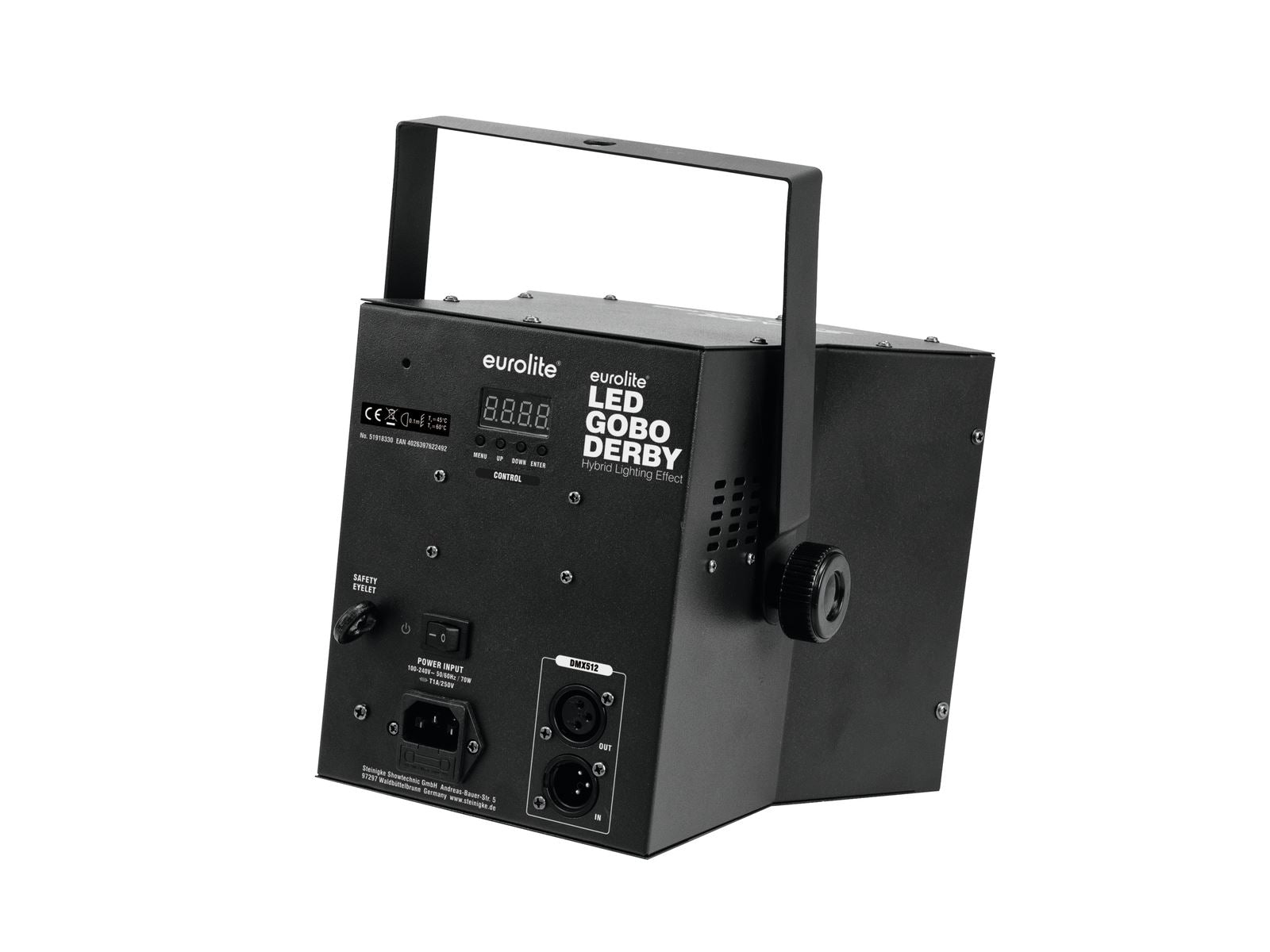 Alles in Einem: Gobos, UV-Licht und Strobe! Bunte Lichteffekte und eine Vielzahl wunderschöner Bewegtbilder machen den LED Gobo Derby Hybrid von Eurolite zum echten Partyhit! Das Gerät kommt in einem kompakten Gehäuse und bietet ein rotierendes Goborad, UV-LEDs für coole Schwarzlichteffekte und weiße LEDs für schnelle Strobe-Effekte. Alle Effekte können individuell gesteuert und nach Ihren Wünschen angepasst werden. Der LED Gobo Derby Hybrid verfügt über 4 voreingestellte Showprogramme, die entweder automatisch oder musikgesteuert abgespielt werden können. Insgesamt können Sie zwischen vier Betriebsmodi wählen: Dem automatischen, musikgesteuerten, Master/Slave- und DMX-Modus. Die Empfindlichkeit des für den musikgesteuerten Modus verwendeten Mikrofons kann manuell eingestellt werden. Das robuste Metallgehäuse ist mit einer verstellbaren Halterung, einer Sicherheitsöse sowie einem hellen Display mit 4 Bedientasten für eine intuitive Bedienung ausgestattet. Die mitgelieferte IR-26-Fernbedienung macht die Arbeit mit diesem Alleskönner noch komfortabler.