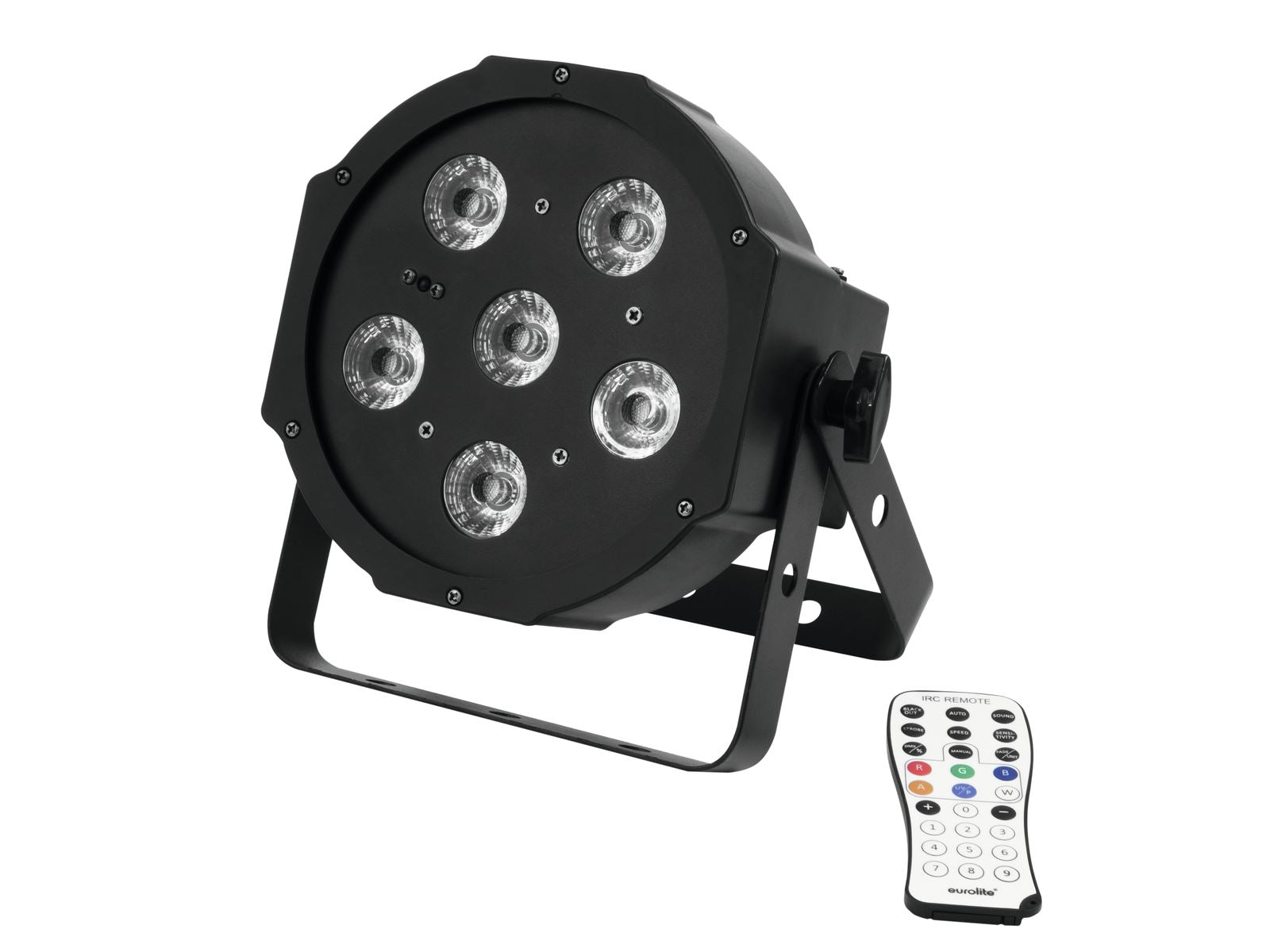Zusätzliche Steuerungsmöglichkeit über die im Lieferumfang enthaltene EUROLITE IR-7 Fernbedienung