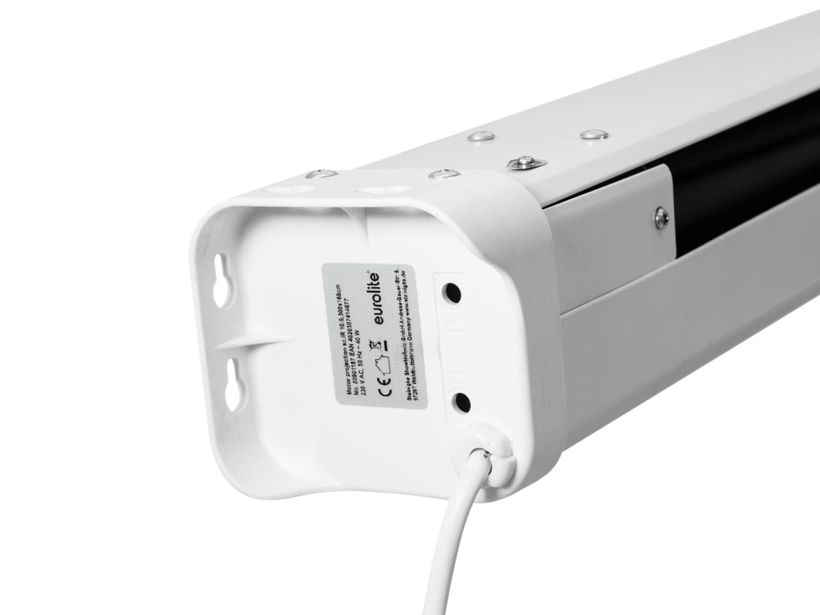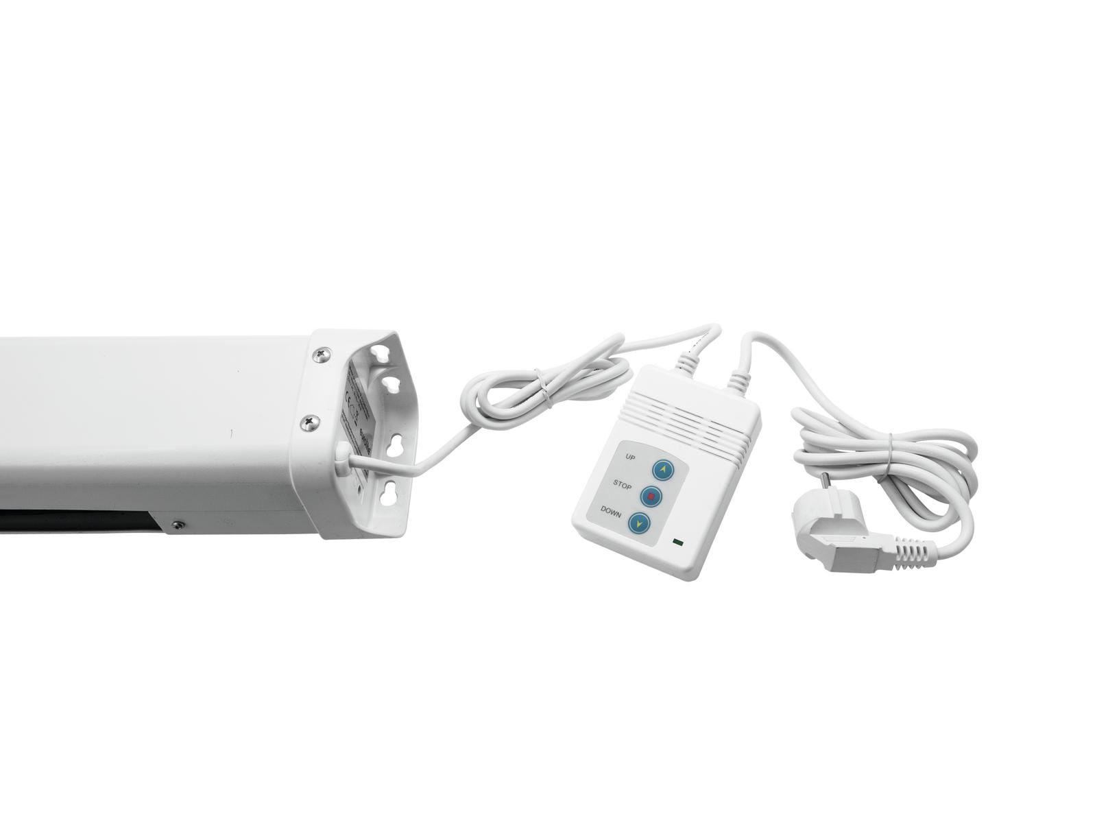 Motorleinwand mit IR-Fernbedienung Die motorisierten Leinwände von Eurolite bieten Ihnen eine schnelle Installation und hohen Bedienkomfort in einem stilvollen Design. Hochwertiges Bildschirmmaterial sorgt für optimale Bildqualität. Die Bildschirme eignen sich hervorragend für Konferenzräume, Partyräume oder das eigene Wohnzimmer. Sehr gute Bildqualität. Dieser Bildschirm ist ideal für die Wand- oder Deckenmontage. Das dichte Stoffmaterial garantiert eine gleichmäßige Ausleuchtung des Bildes und sorgt für lebendige Farben. Dank der schwarzen Rückseite ist die Leinwand völlig blickdicht und bietet somit eine ideale Projektionsfläche. Eine Gewichtsstange verhindert Wellen oder Bewegungen des Bildschirms. Der Getriebemotor ist geräuscharm und verfügt über eine stufenlose Höhenverstellung mit automatischem Stopp. Robuste Verarbeitung, einfache Bedienung. Das Gehäuse besteht aus weißem Stahlblech und verleiht der Leinwand ein modernes Aussehen. Die Bedienung erfolgt ganz bequem über einen fest montierten Schalter oder die mitgelieferte Infrarot-Fernbedienung. Die Motorleinwand wird anschlussfertig mit Netzstecker geliefert.