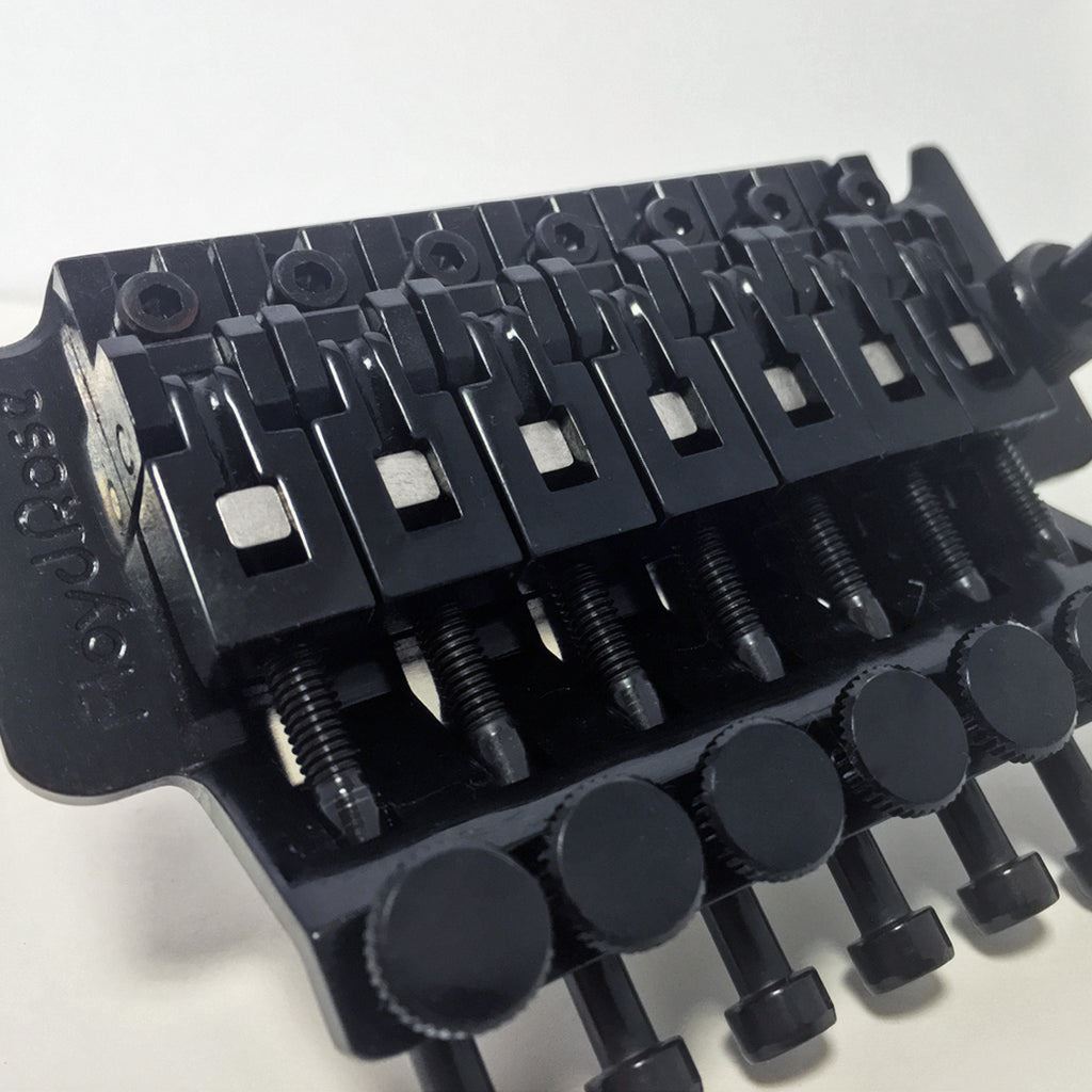 Titanium itself, is as strong as high-strength steel, but 40% lighter and corrosion-free against acidic sweat and dirt, whilst increasing vibrato performance and resistance to any deforming or cracking when subjected to high compressive forces from string clamping.