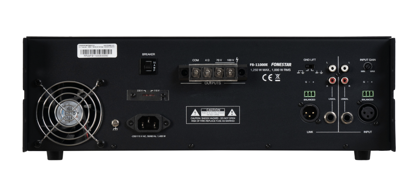 The Fonestar FS-11000E is a professional, high-power mono-channel amplifier (power stage) designed for public address and commercial sound installations where significant power and multi-impedance flexibility are required. It is an ideal solution for large venues such as factories, hotels, and transport stations.