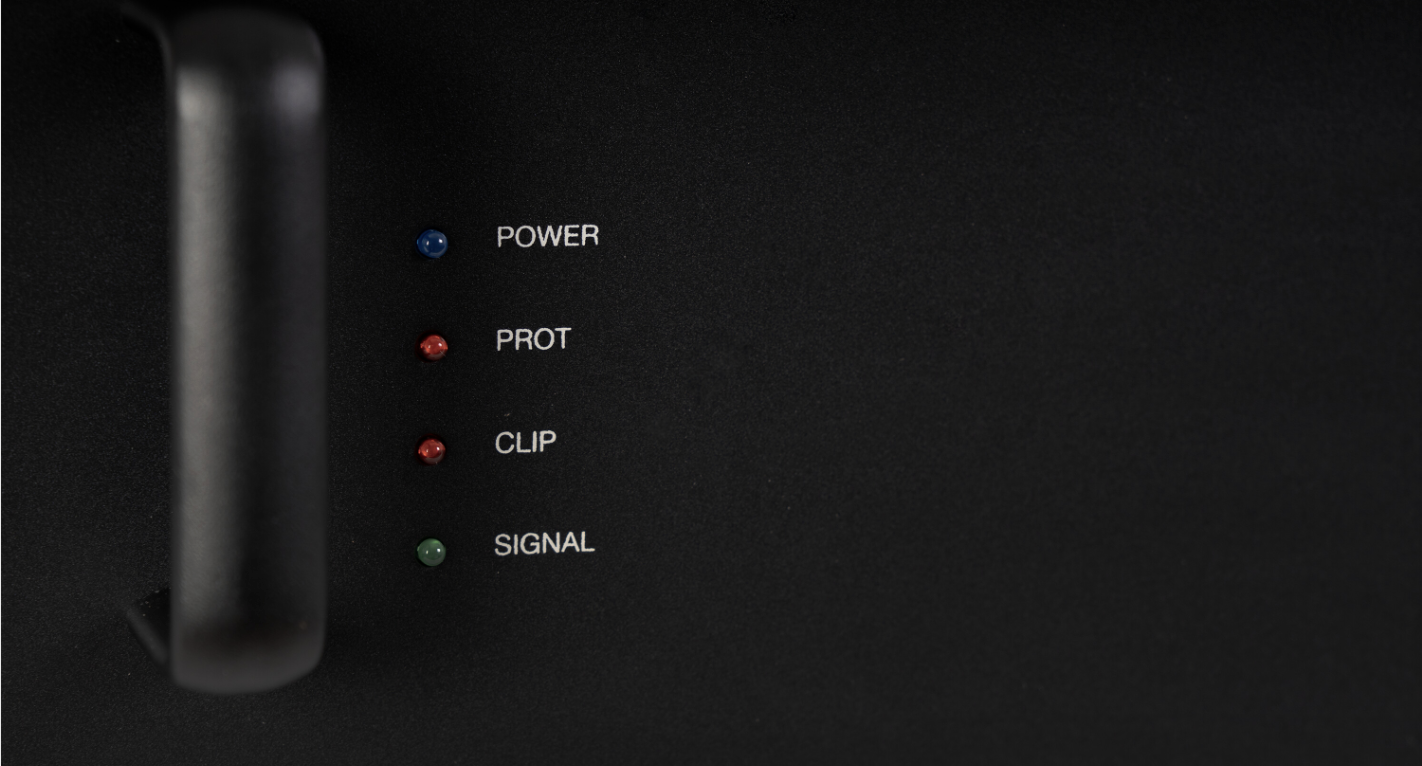 Monitoring is handled via LED indicators for protection status, signal peak, and signal output.