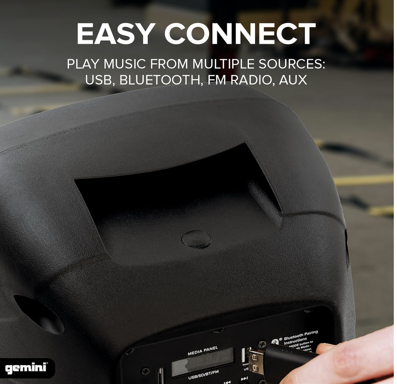 USB, SD, FM, Bluetooth, and AUX give you media options on demand: Play music wirelessly via Bluetooth or directly from USB, SD card, AUX input, or FM radio. This compact portable sound system offers flexible playback wherever your event takes you.