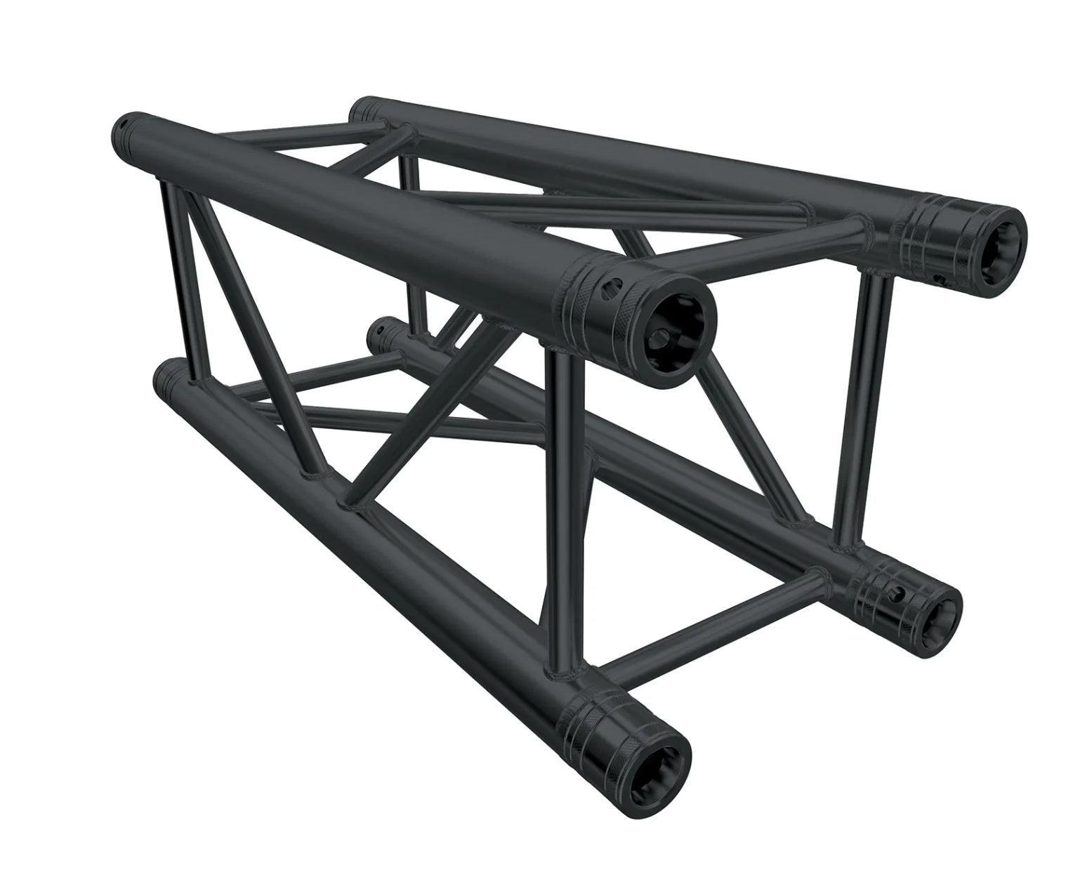 The F34 truss series by Global Truss is a TÜV approved 4-point system with an external dimension of 29cm. With its excellent load capacity relative to weight and size, the F34 system is one of the most widely used in the industry. From exhibition stands and shop fittings to stage roofs and outdoor structures, F34 truss offers versatility and strength. Constructed from 50x2mm main tubes and 20x2mm diagonal braces of aluminium, each section is supplied with conical connectors for secure assembly. This black powder-coated version provides a professional finish suitable for stage and event environments. The system can also be powder coated in any RAL colour on request.