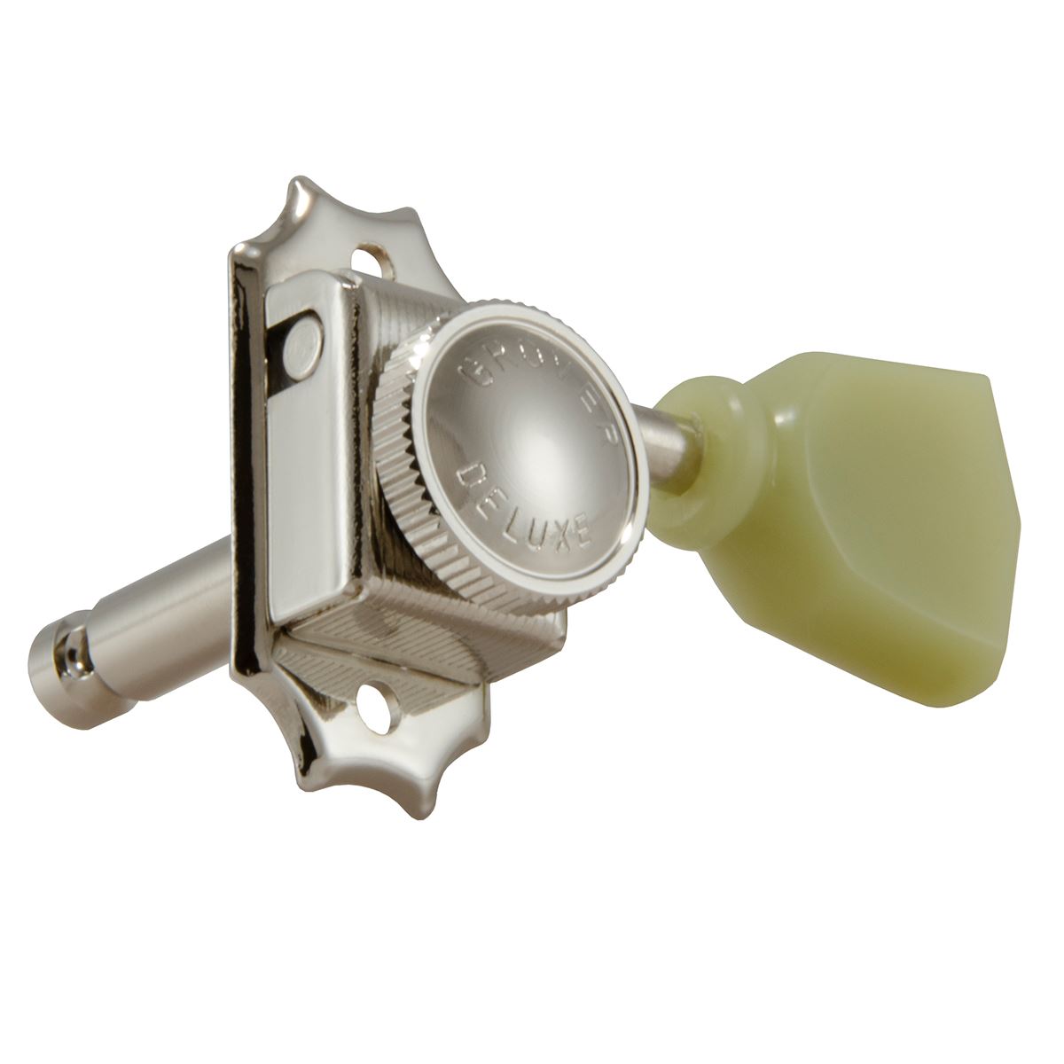 Mechanically engineered to the most precise standards of excellence, with the classic look of vintage styling, Grover™s Vintage 533 locking series come with a œthumb screw mechanism, which locks the string into place. Insert the string through the post hole, wrap around once, then lock by tightening with the thumb screw. Worm and gear are cut to mesh perfectly, thereby eliminating backlash and slippage. The housings are self-lubricating for a lifetime of trouble-free service. 15:1 gear ratio.