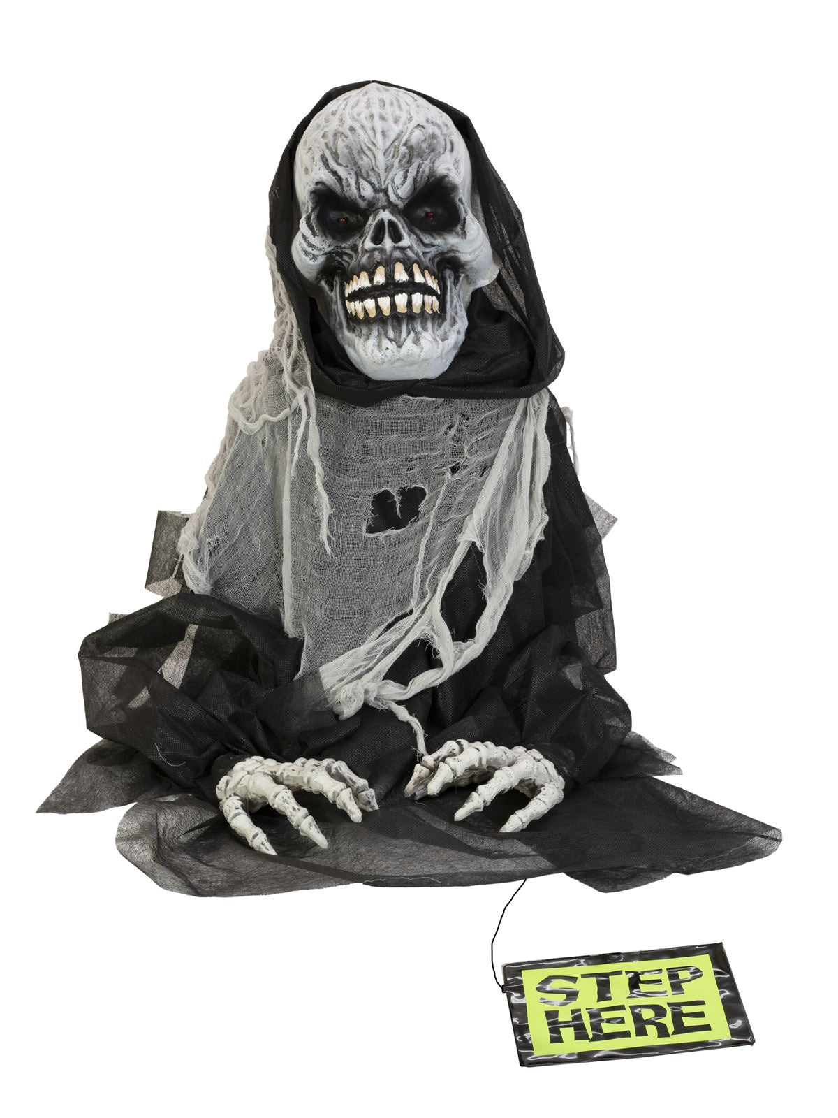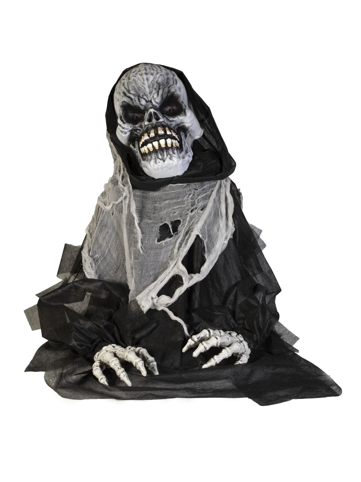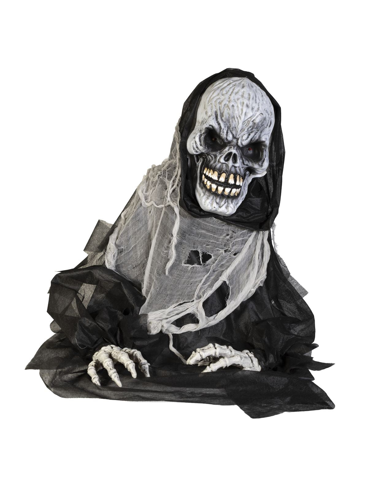 Sie sind noch auf der Suche nach dem passenden Highlight für Ihre Motto- oder Halloween-Party? Das graue, übergroße Gesicht des Sensenmanns mit seinen groben Gesichtszügen verfehlt allein seine Wirkung auf den Betrachter nicht. In jeder der riesigen Augenhöhlen befindet sich eine rot blinkende LED. Während eine Stimme mit Spukhaussound ertönt, neigt sich der Körper der Büste über einen Exzenterantrieb nach links und rechts. Der tote Mann von Europalms trägt einen zerrissenen Kapuzenumhang, an dessen Enden übergroße knöcherne Hände befestigt sind. Die Animation wird durch ein integriertes Mikrofon oder eine kabelgebundene, manuelle Steuerung aktiviert. Da sich die Figur selbstständig bewegt, achten Sie bitte vor Beginn der Animation darauf, dass die Lagerfläche ausreichend groß und gesichert ist.