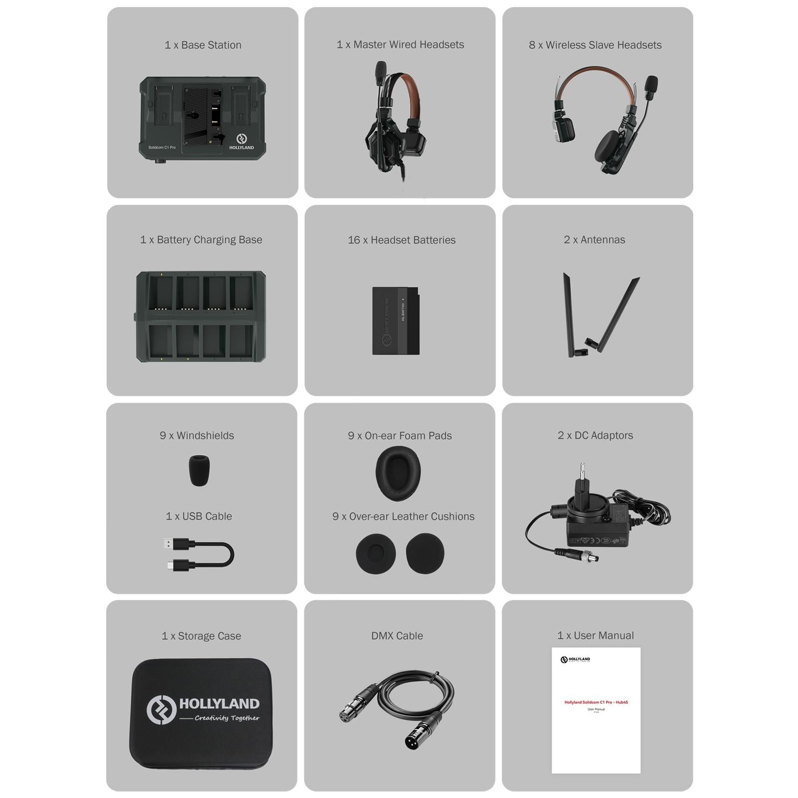 Contents: 1 x Solidcom HUB, 1 x Wired Headset, 8 x Slave Wireless Headset, 16 x Headset Battery, 9 x Over-ear Leather Cushion, 9 x On-ear Foam Pad, 1 x Charging Base, 2 x DC Adaptor, 9 x Windshield, 1 x USB Cable, 2 x Antenna and 1 x Storage Case