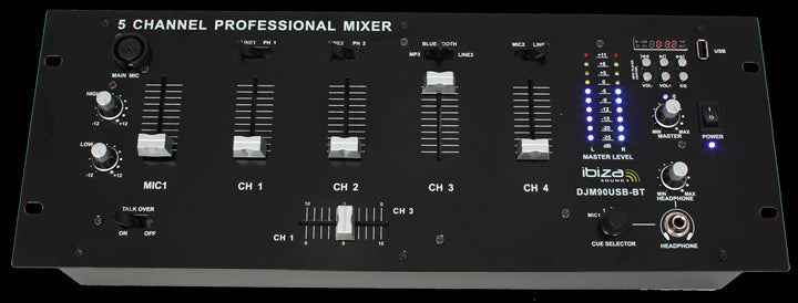 Mixer mit MP3-USB/SD-Player im 19-Zoll-Rackformat in glänzendem Schwarz, ausgestattet mit einer Bluetooth-Verbindung zur Eingabe externer Quellen wie Tablet-PCs, Mobiltelefone usw.
