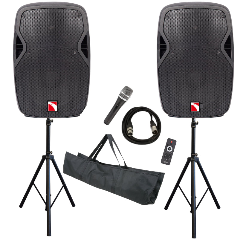 This powerful sound system is ready to use out of the box and includes a wired dynamic microphone, XLR cable, 2 x IR remotes, 2 x IEC power cables. Also included is a pair of sturdy tripod stands with adjustable height including a carry bag.