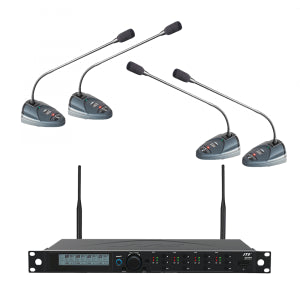 CS-W4 ist mit der neuesten Wireless- und Konferenztechnologie von JTS ausgestattet. Es bietet maximierte kompatible Kanäle mit einer bestimmten Bandbreite. Die integrierte Logikschaltung bietet eine Konferenzfunktion. Ein mit Priorität zugewiesenes Mikrofon fungiert als Vorsitzendeneinheit. Es hat Vorrang vor anderen Mikrofonen. Die Logikeinstellung eines CS-W4C-Empfängers ist kaskadierbar. Ein Mikrofon mit Priorität in einem Empfänger hat auch in einem kaskadierten System Vorrang. Das von JTS patentierte REMOSET synchronisiert alle vier Mikrofone gleichzeitig per Knopfdruck. Das Mikrofon hat eine Bandbreite von 108 MHz. Mit dieser Funktion können mehr Teilnehmer an der Konferenz teilnehmen.