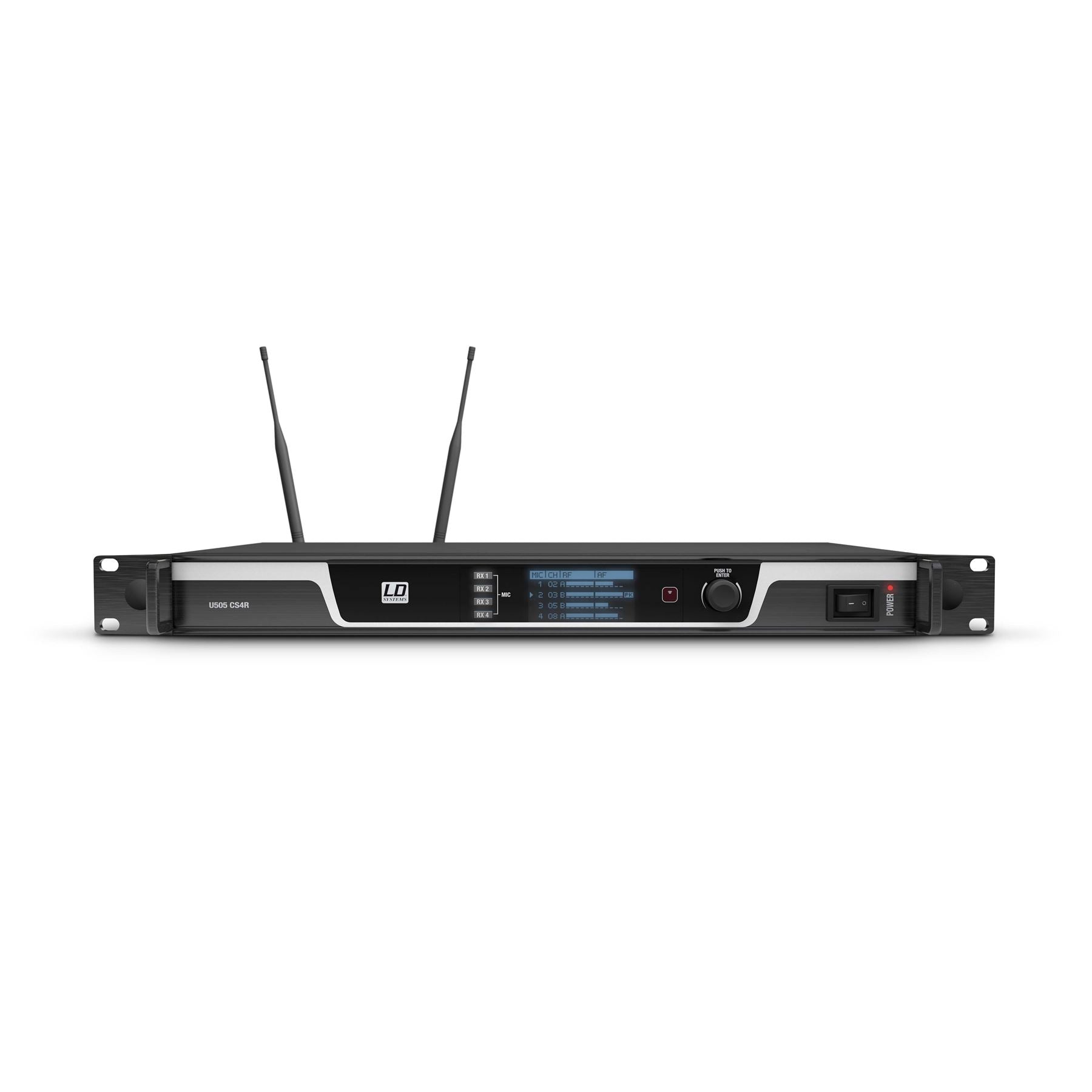 Bedienelemente: digitaler Encoder, Ein-/Ausschalten, RX 1 – 4 Schnellzugriffstasten