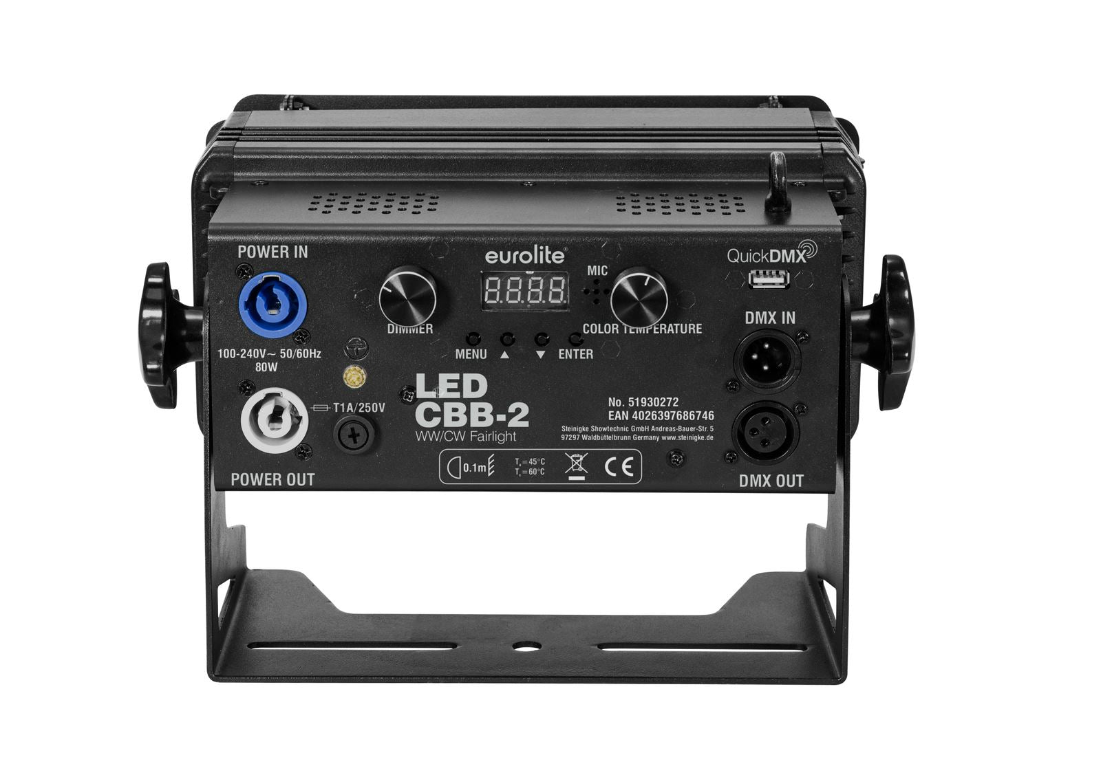 | Kontrolle: | Eigenständige; DMX; QuickDMX über USB (optional); IR-Fernbedienung; Schnellwahlpotentiometer für Helligkeit und Farbtemperatur; Master/Slave-Funktion; Ton zu Licht über Mikrofon |