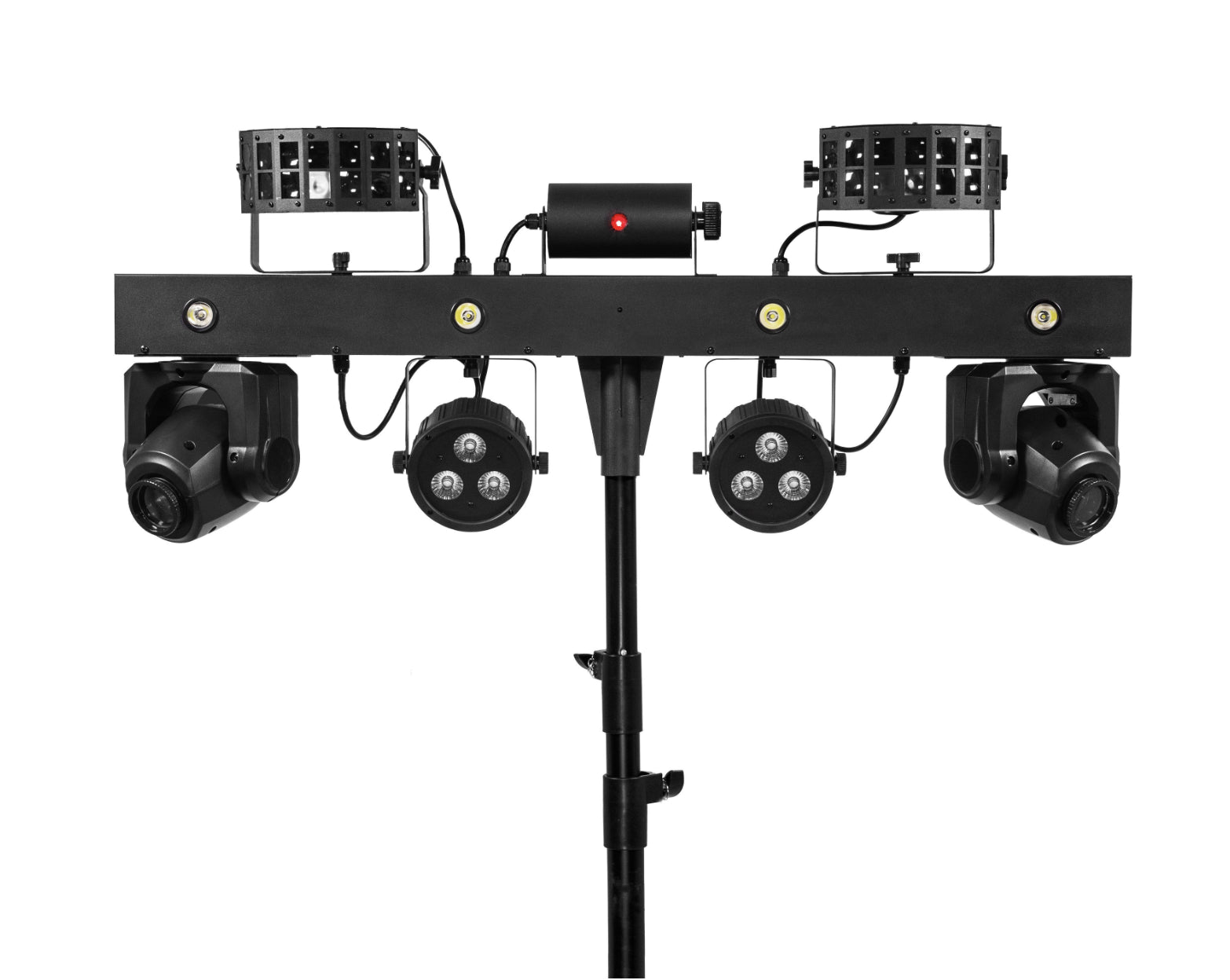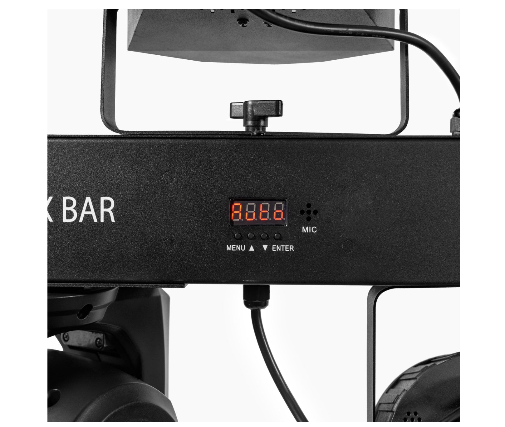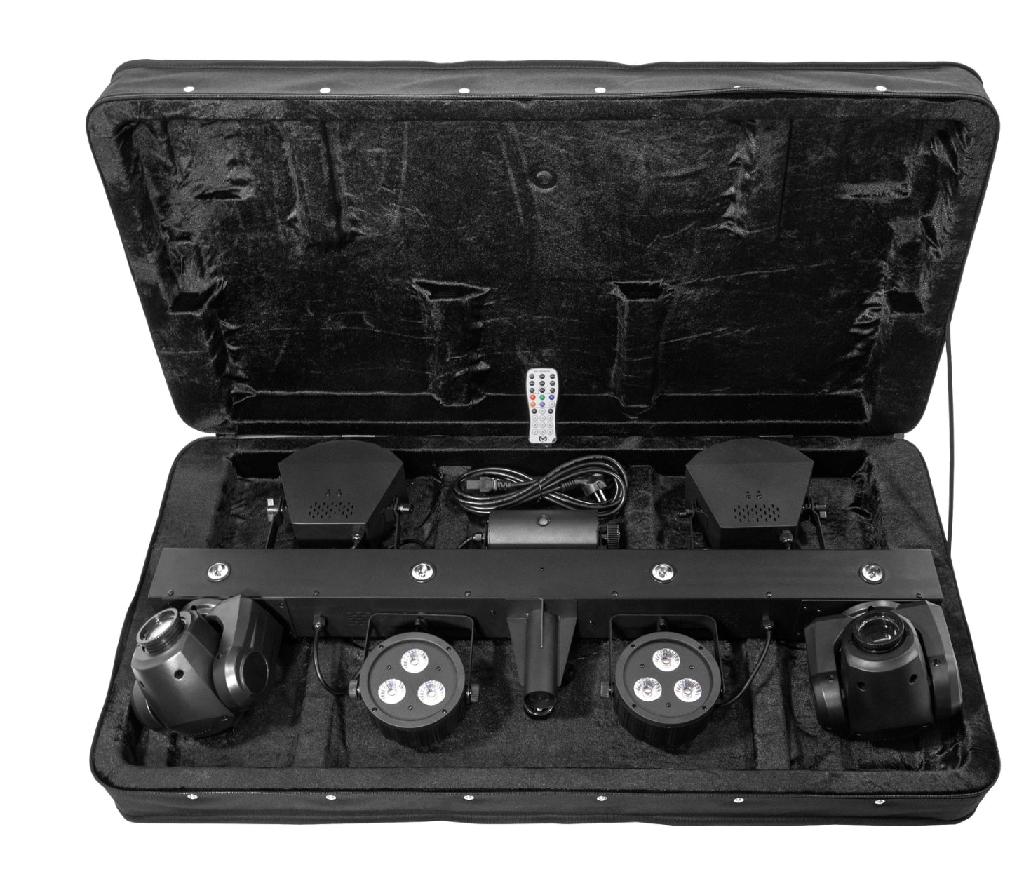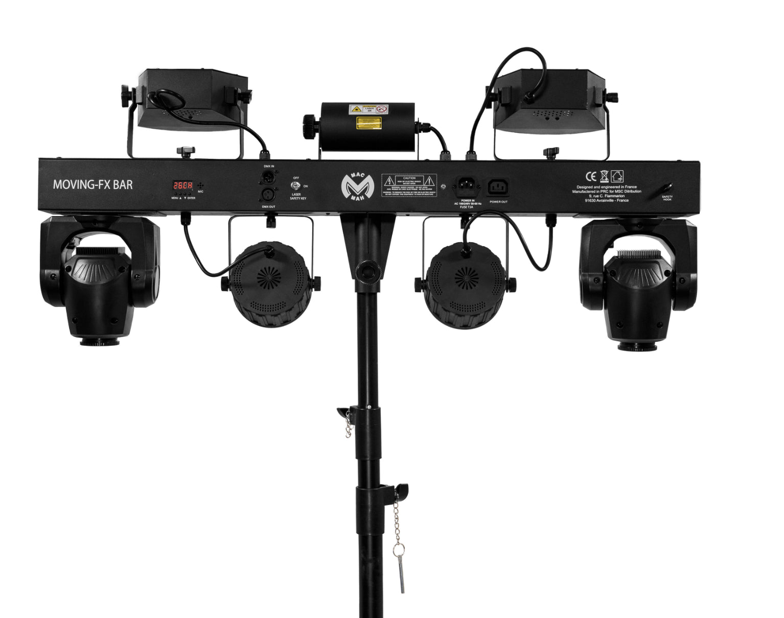 Mac Mah Moving-FX Bar with 2 x 30 W spotlights, 2 x Derby effects, 2 x 4-in-1 RGB-UV LED PARs, a Strobe effect with 4 white LEDs integrated into the bar and a red and green multipoint LASER. Supplied with carry bag and wireless remote control. It's Plug & Play and will be the partner of your liveliest parties. Ideal for mobile DJs.