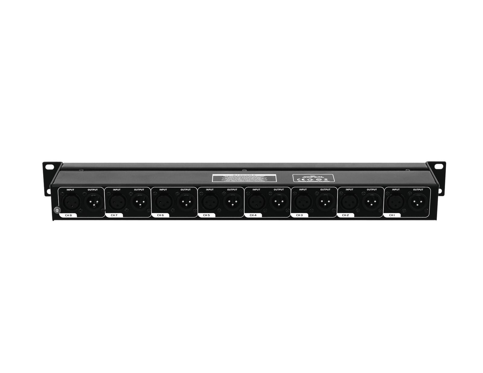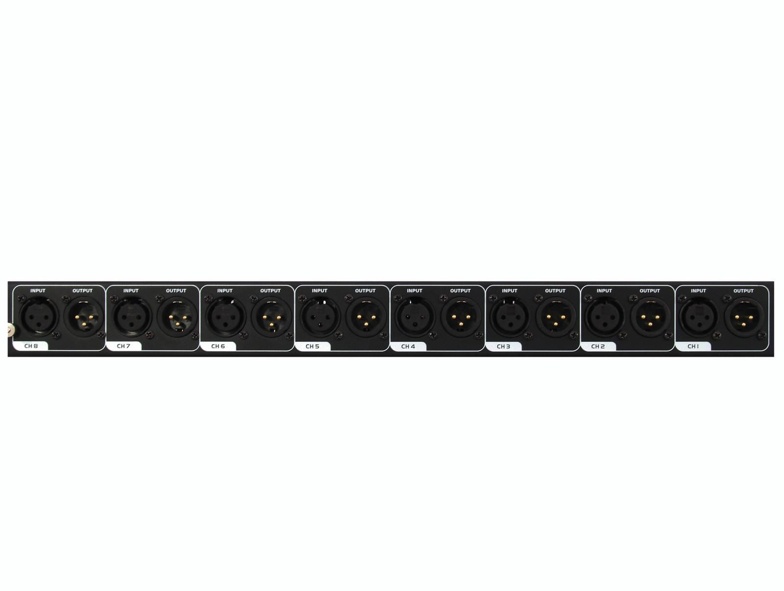 Verbindungen: | Eingang: 8 x Line über 3-Pin XLR Ausgang: 8 x Line über 3-Pin XLR Eingang: 8 x Line über 6,3 mm Klinkenbuchse (Stereo) Einbauversion Ausgang: 8 x Line über 6,3 mm Klinkenbuchse (Stereo) Einbauversion Ausgang: 8 x Line über Stereo-Cinch |
