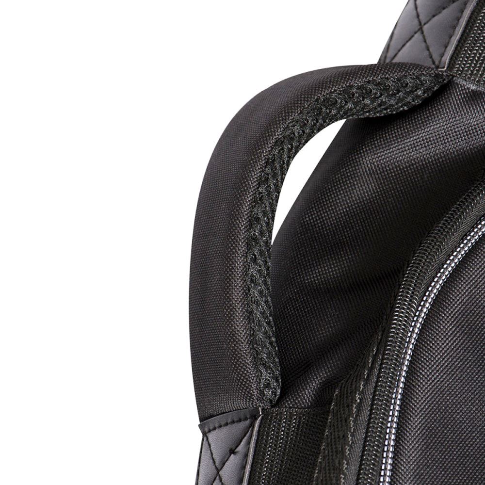 The GB-4770 line of Deluxe Guitar Gig Bags features lightweight custom-shaped models to protect and transport your favorite instruments. Each model combines the protection of a half inch foam-lined interior with the portability of a canvas bag. Features include 2 exterior accessories pockets with leather accent strips, heavy duty two-pull zippers, a padded side carry handle, a padded top carry handle, adjustable backpack straps, an ID tag, and two bag hanger loops. Gray piping and an embroidered emblem add to the upgraded styling of these gig bags.