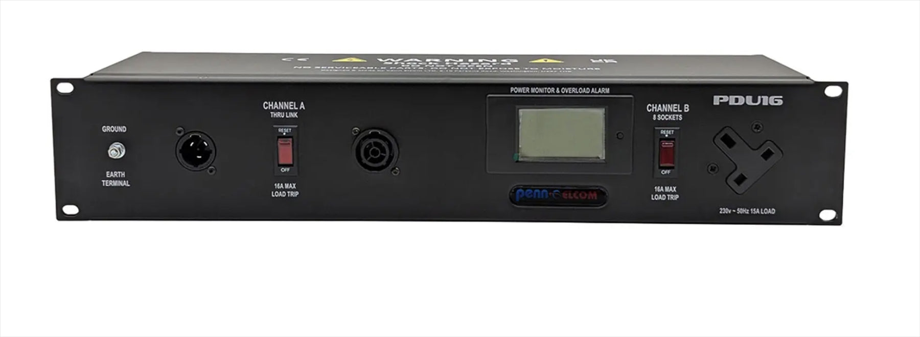 The Penn Elcom PDU16-UKTR1 is a rugged 2U 19" power distribution unit designed for demanding stage studio and touring environments. Featuring a Neutrik powerCON True1-TOP inlet and outlet it includes 8x 13A UK sockets split across two protected circuits. Circuit A handles inlet and loop-through functions with its own 16A breaker while Circuit B supplies the UK sockets with a dedicated illuminated breaker and integrated LCD monitor displaying voltage current power and energy. Steel housing rackmount format and rear earth bonding point make this a dependable and intelligent distro choice for professionals. 8 x UK outlet sockets with 16A overload trip switch – ideal for stage studio and touring power distribution Circuit A