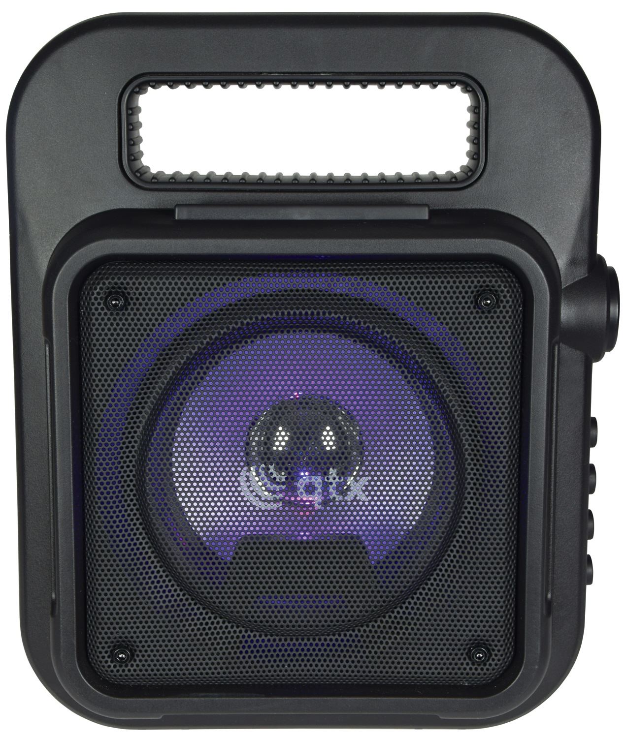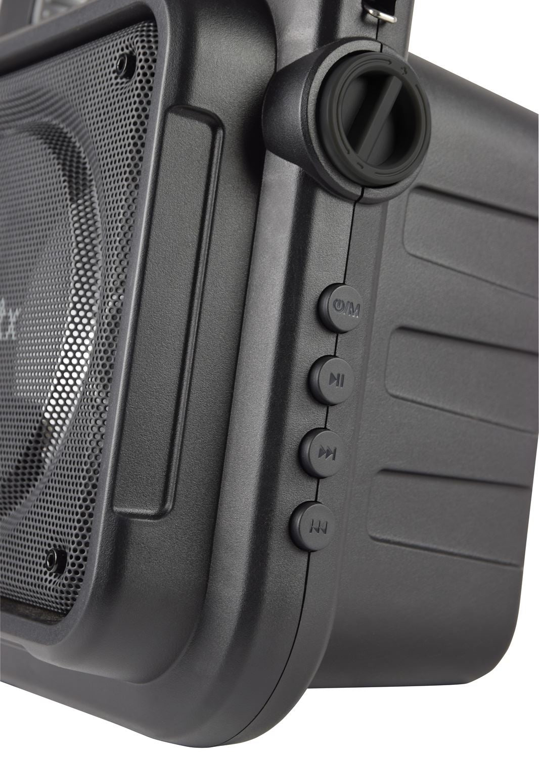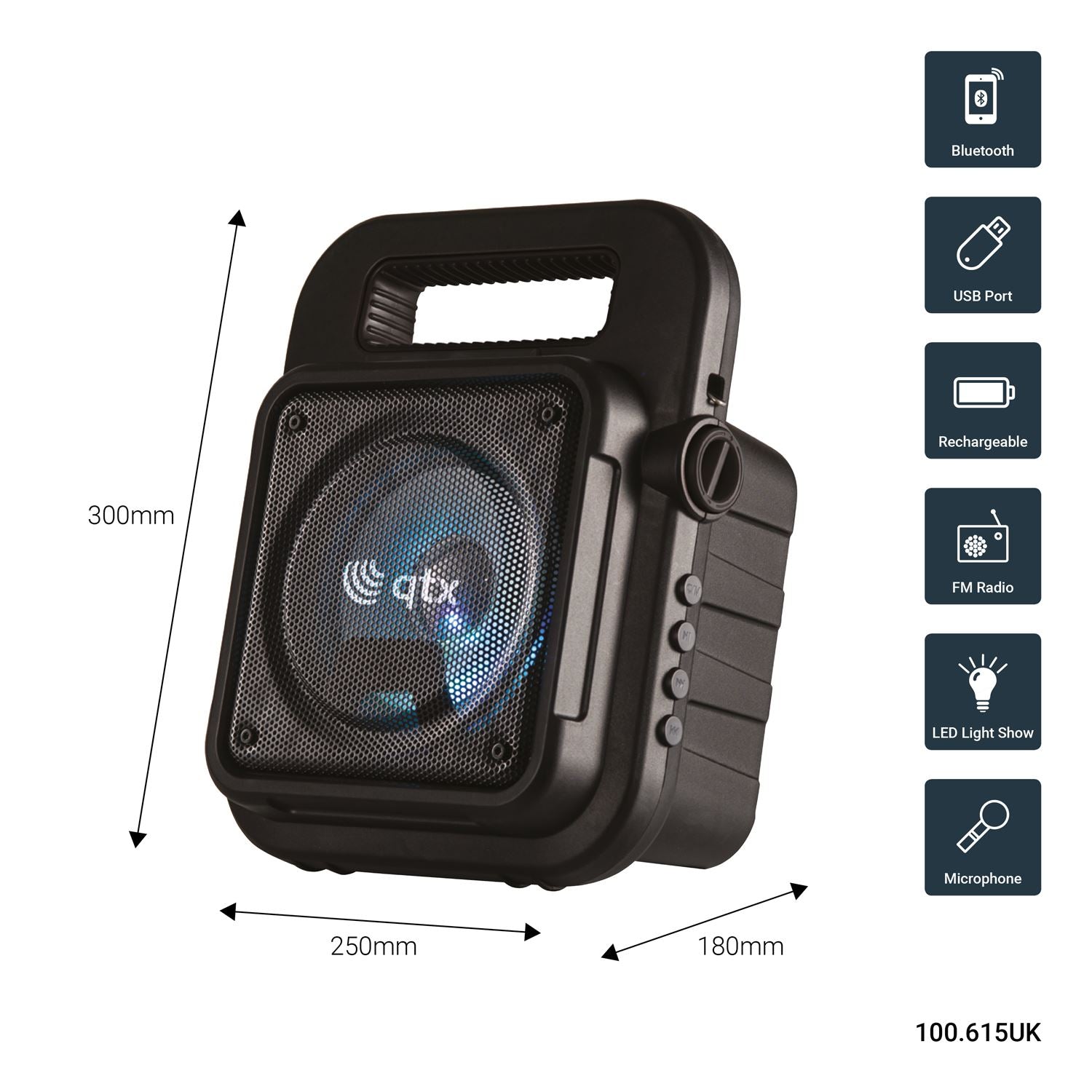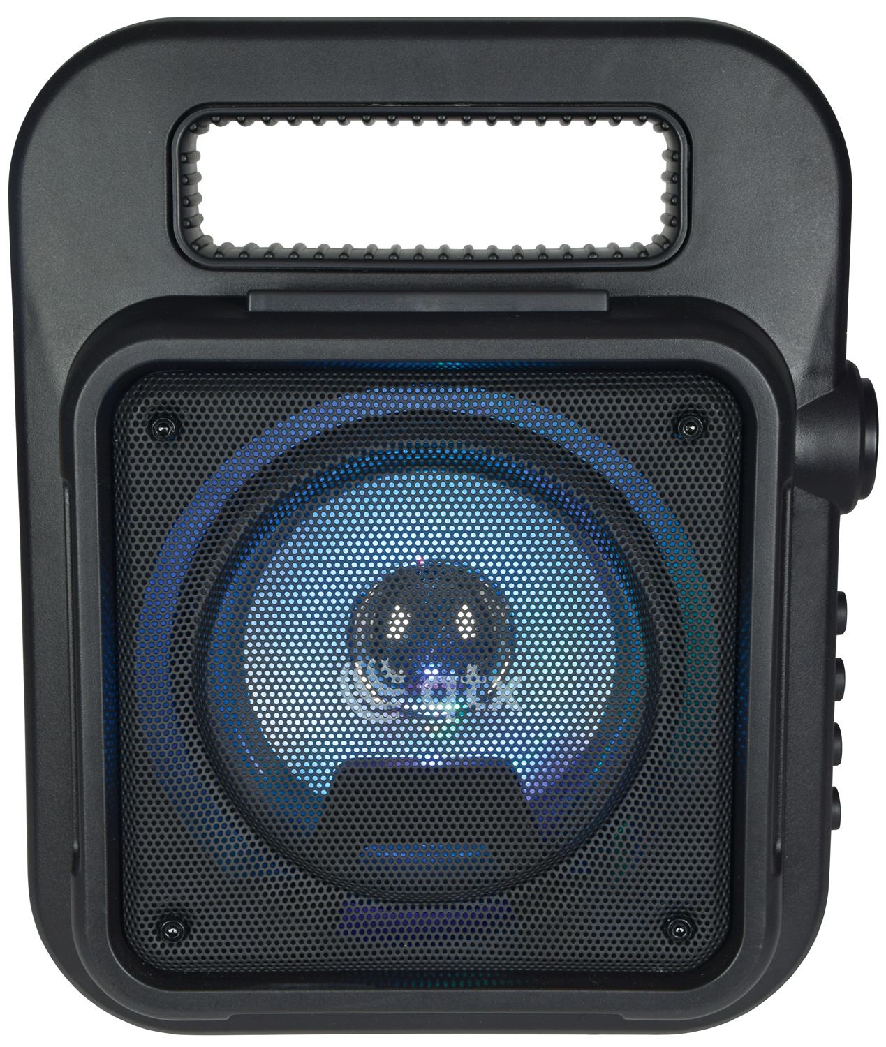 Nehmen Sie die Party überall hin mit, mit einem tragbaren Bluetooth-Lautsprecher mit farbenfroher LED-Lichtshow. Perfekt für Karaoke-Könige und -Königinnen. Schließen Sie einfach das Mikrofon an, um Ihr Talent zu zeigen und Mitsingen mit der Sprachaufzeichnungsfunktion aufzunehmen. Spielen Sie Ihre Musik über Bluetooth von Ihrem Smart-Gerät ab, nutzen Sie die integrierten Medienanschlüsse oder sogar UKW-Radio. Dieser Lautsprecher ist leicht genug, um am Schultergurt getragen zu werden, und verfügt über einen internen wiederaufladbaren Akku mit einer Akkulaufzeit von bis zu 3 Stunden.