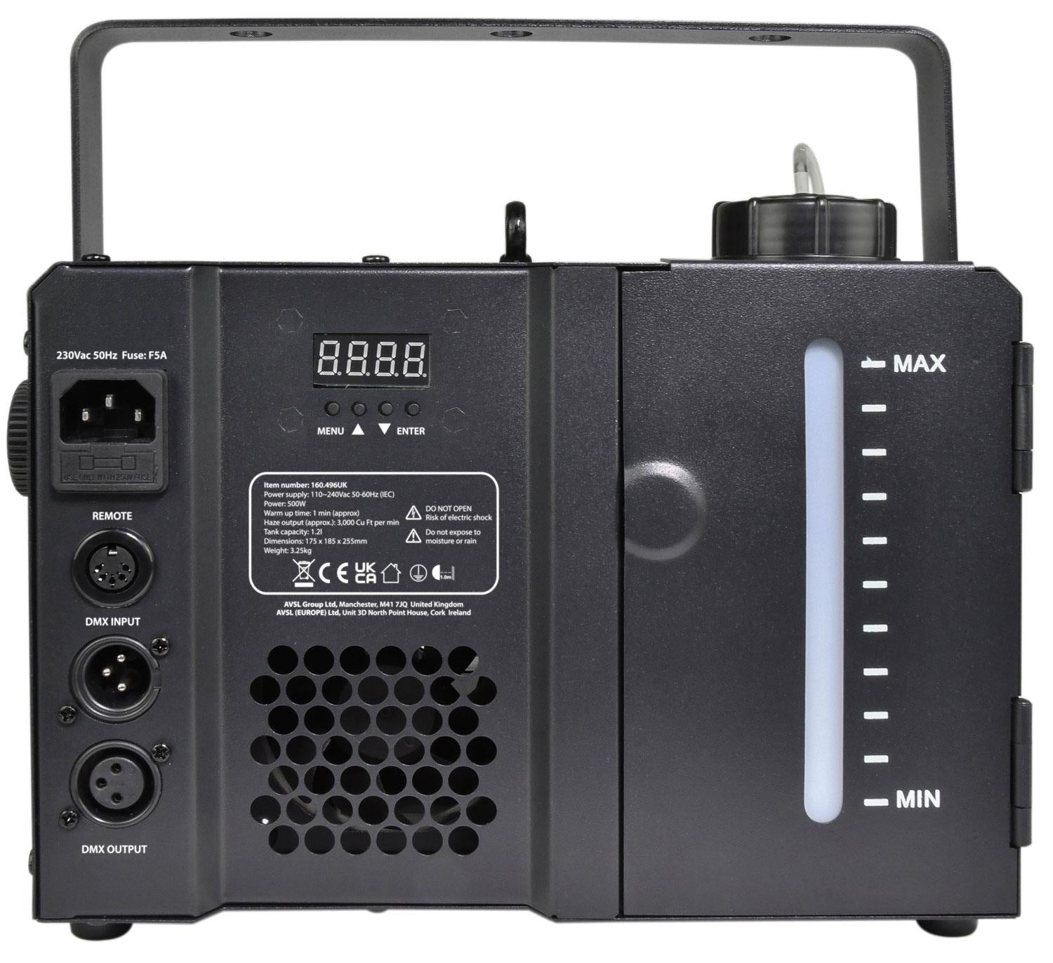 Digitally controlled portable haze machine with a sturdy metal housing for small and medium sized venues. Haze output can be set via the rear control panel, the included keyfob style RF-wireless remote or by DMX signal if preferred. The fluid bottle is encased by a neat magnetic door and can be removed for easy refilling. There is a slot window to show the current fluid level and a low level fluid cut-off switch to protect the unit from damage when running dry. Designed to offer professional level haze effects in a compact format for easy installation and portability.