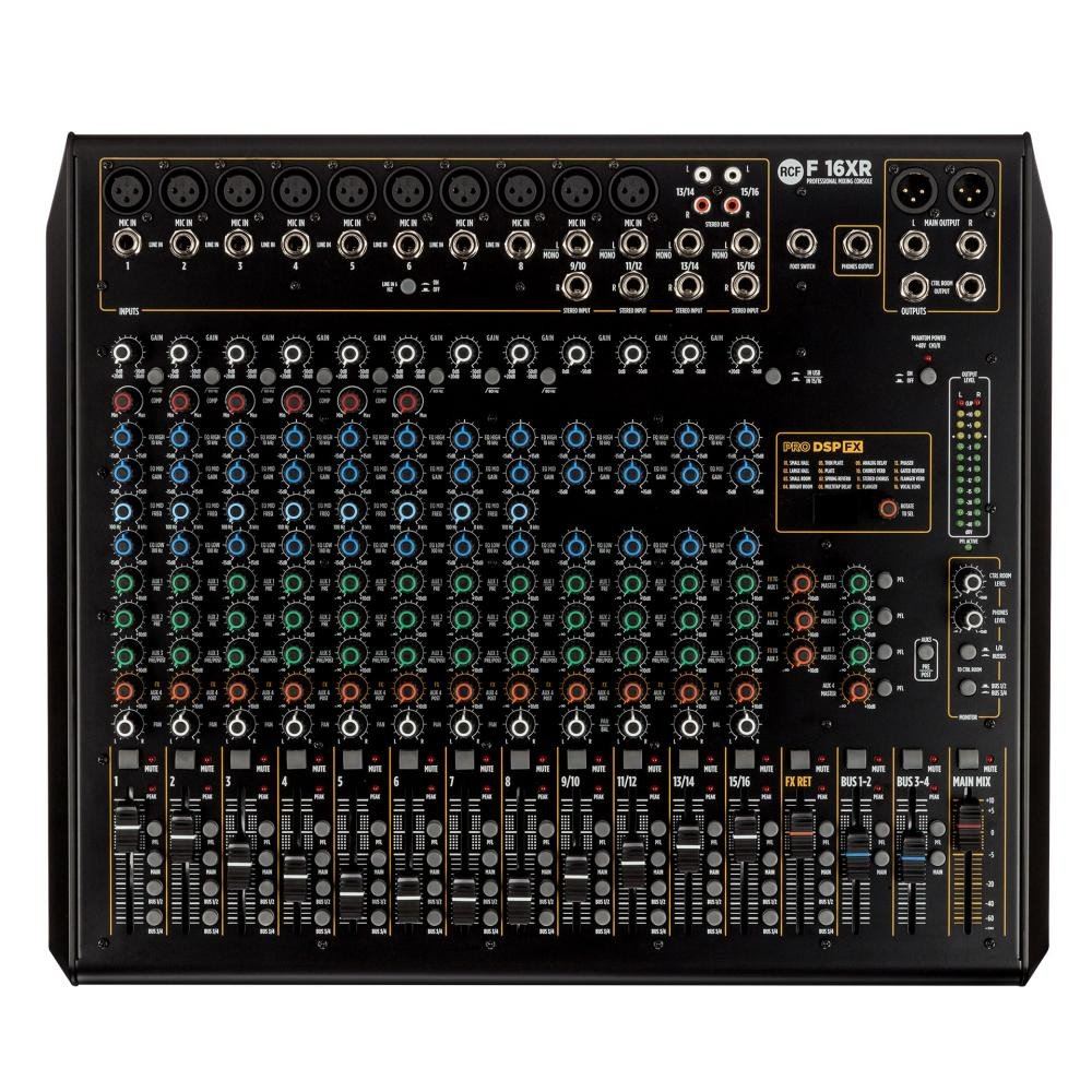 Der F 16XR verfügt über 10 Mikrofonvorverstärkereingänge, 4 Mono-Line-Eingänge, 4 Stereo-Line-Eingänge sowie Multi-FX und Aufnahme über den USB-Anschluss, mit symmetrischem Hauptausgang (Stereo XLR + TRS) und 6 Single-Control-Kompressoren. Die Monokanäle sind mit einem 3-Band-EQ mit wählbarer Mittenfrequenz und einem 3-Band-EQ für Stereokanäle ausgestattet. Der Mixer verfügt über 16 interne PRO DSP-Presets, zwei Stereo-Ausgangsbusse und 4 Aux-Sends (2 Pre, 1 Pre/Post, 1 Post). Es verfügt außerdem über 60-mm-Fader.