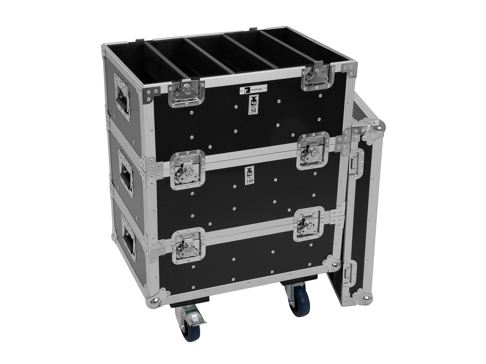 The ROADINGER Flightcase 8× IP PIX Strobe RGB CW+WW is a robust transport case tailor-made for eight EUROLITE IP PIX Strobe RGB CW+WW fixtures. It features a sturdy laminated exterior, protective foam-lined interior compartments, and a divided accessory section for cables and small gear. Equipped with four swivel castors (two with brakes) and chrome butterfly locks, this flightcase offers both secure protection and easy mobility for touring, rentals, and installations.