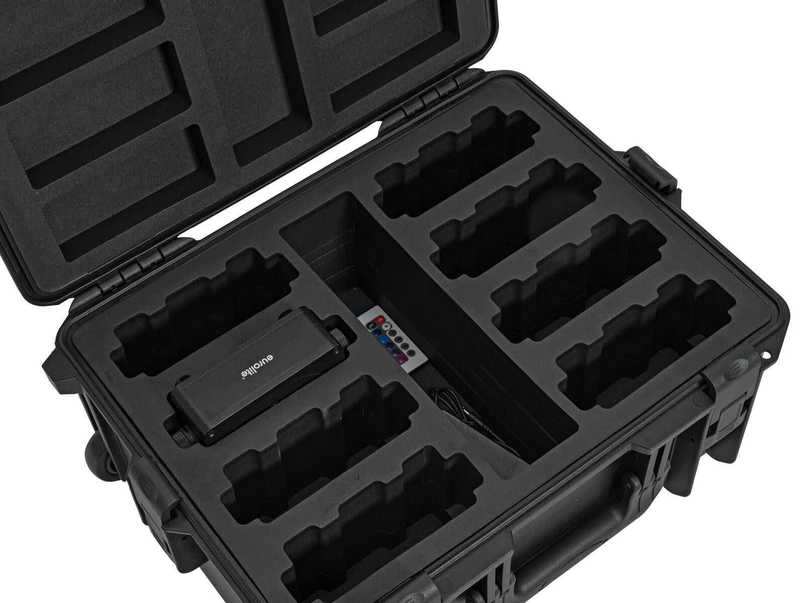 The ROADINGER Plastic Case for 8× AKKU Flat Light with Trolley is a rugged and portable solution for safely storing and transporting up to eight AKKU Flat lights. Featuring a built-in trolley system with two rollers and an extendable handle, it combines ease of mobility with robust protection. Constructed from durable plastic with foam-padded interior, it’s secured by four high-quality snap locks with locking functionality. Designed specifically for EUROLITE AKKU Flat Light fixtures, this case offers professional-level transport convenience and peace of mind for gigging and installation crews.