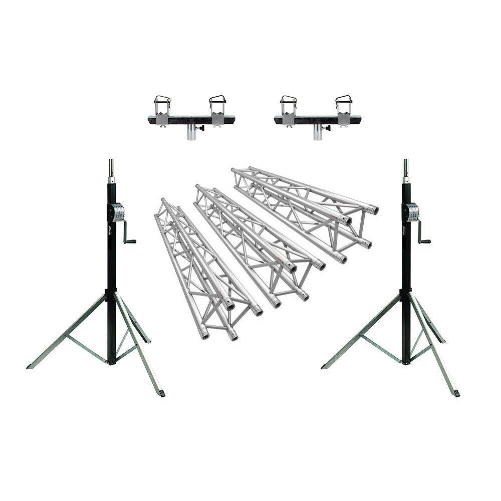 Dieses Paket enthält 2x Showtec Goliath Studio Basic 3800 Aufziehständer, 3x Showtec Pro-30 Square Truss und 2x Showtec Adjustable Truss Rigging Support