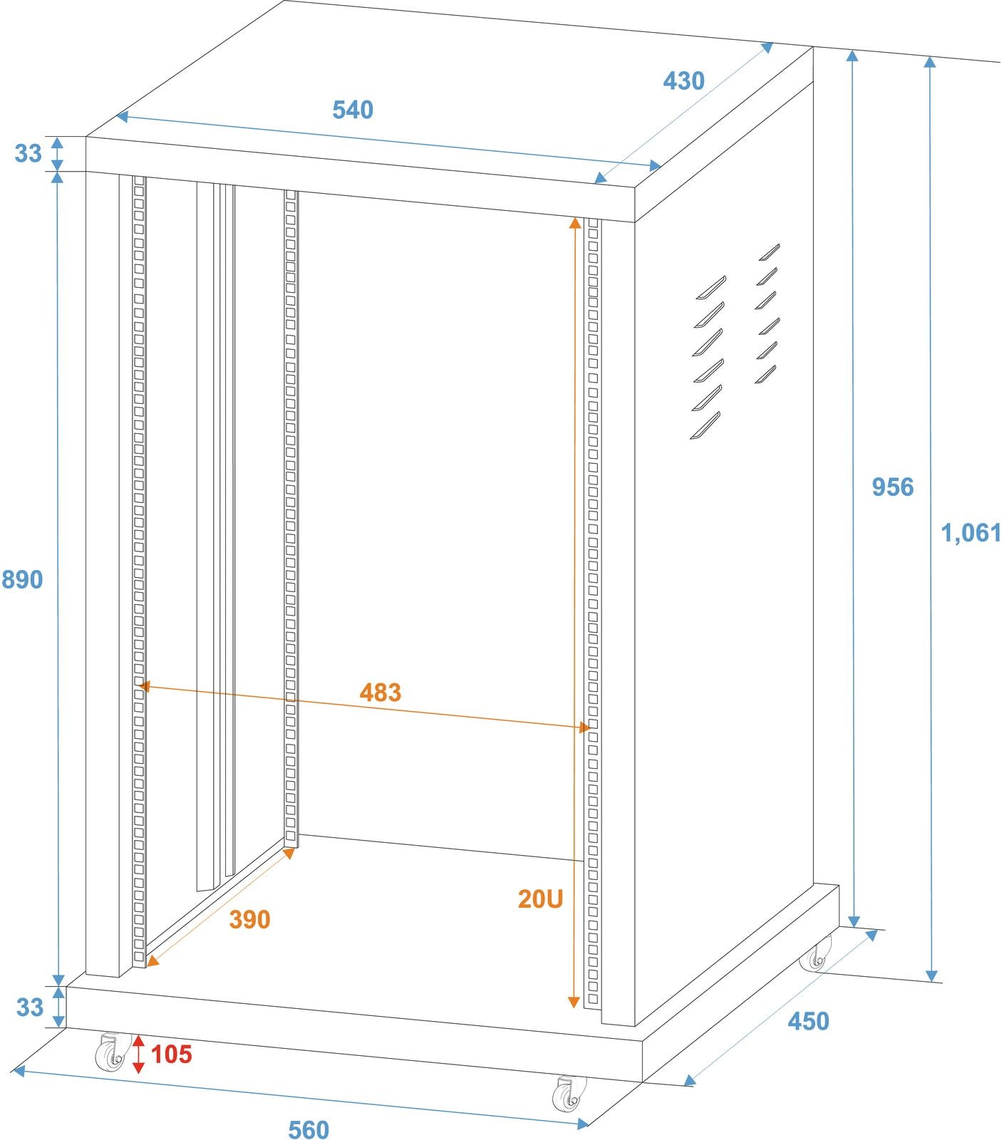 Pulverbeschichtetes Stahlregal, ideal für FestinstallationenDas pulverbeschichtete Stahlregal von ROADINGER ist ideal für Ihre Festinstallationen geeignet. Es ist vorne und hinten mit gestanzten Rackschienen und vier Lenkrollen ausgestattet. Die integrierte Tragschiene in den Seitenwänden ist für schwere Geräte wie Leistungsverstärker konzipiert. Die Einbautiefe beträgt 41 cm und die Höhe 20 HE. Die maximale Belastung beträgt 100 kg.