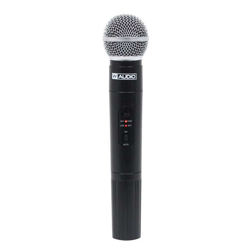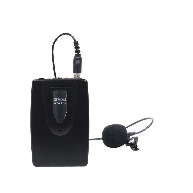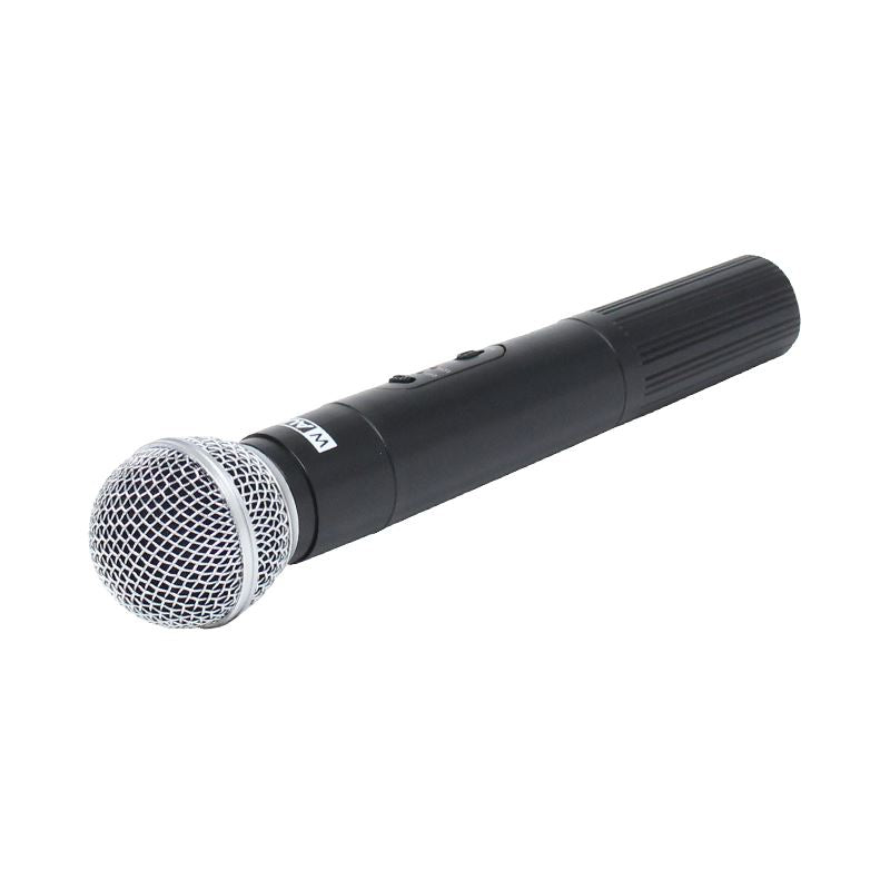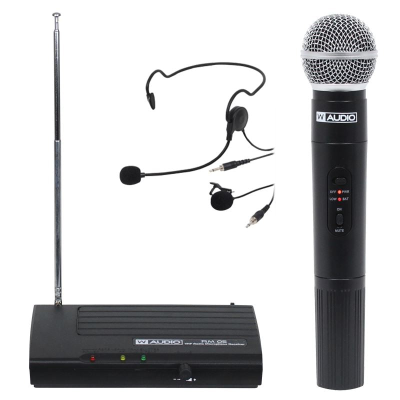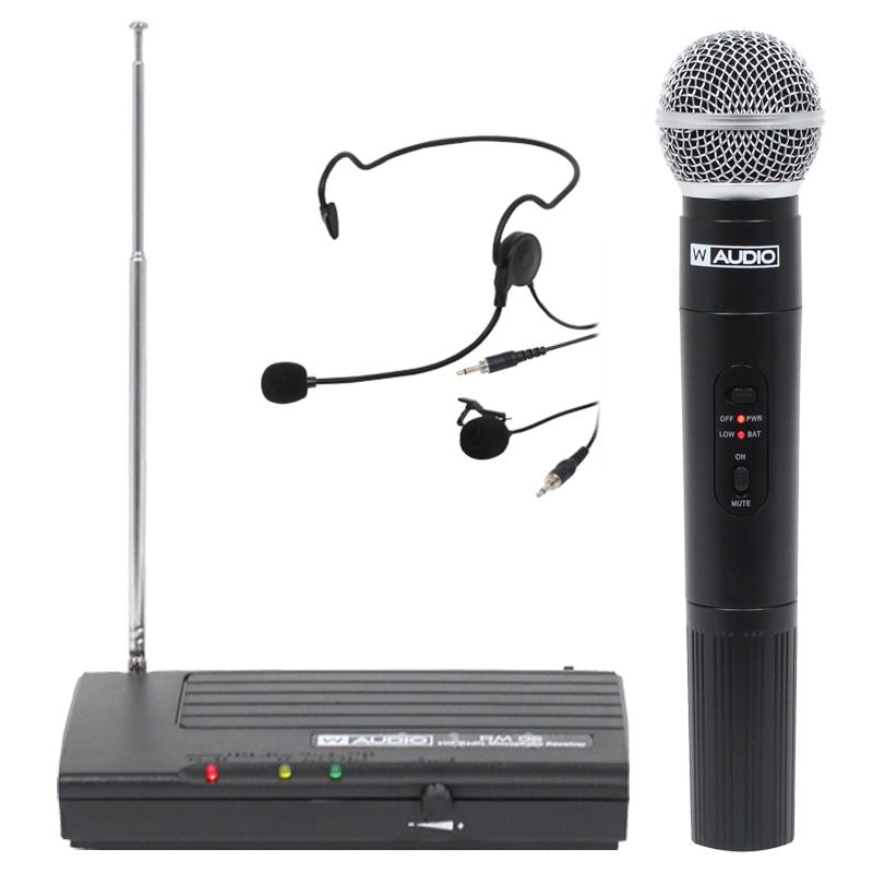 Ein komplettes Funkmikrofonsystem, das dem Benutzer die Wahl zwischen Hand-, Headset- oder Lavaliermikrofonen in einem Paket bietet. Benötigt werden 1 x PP3 9 V (Gürteltasche) und 2 x 1,5 V AA-Batterien (Handgerät).