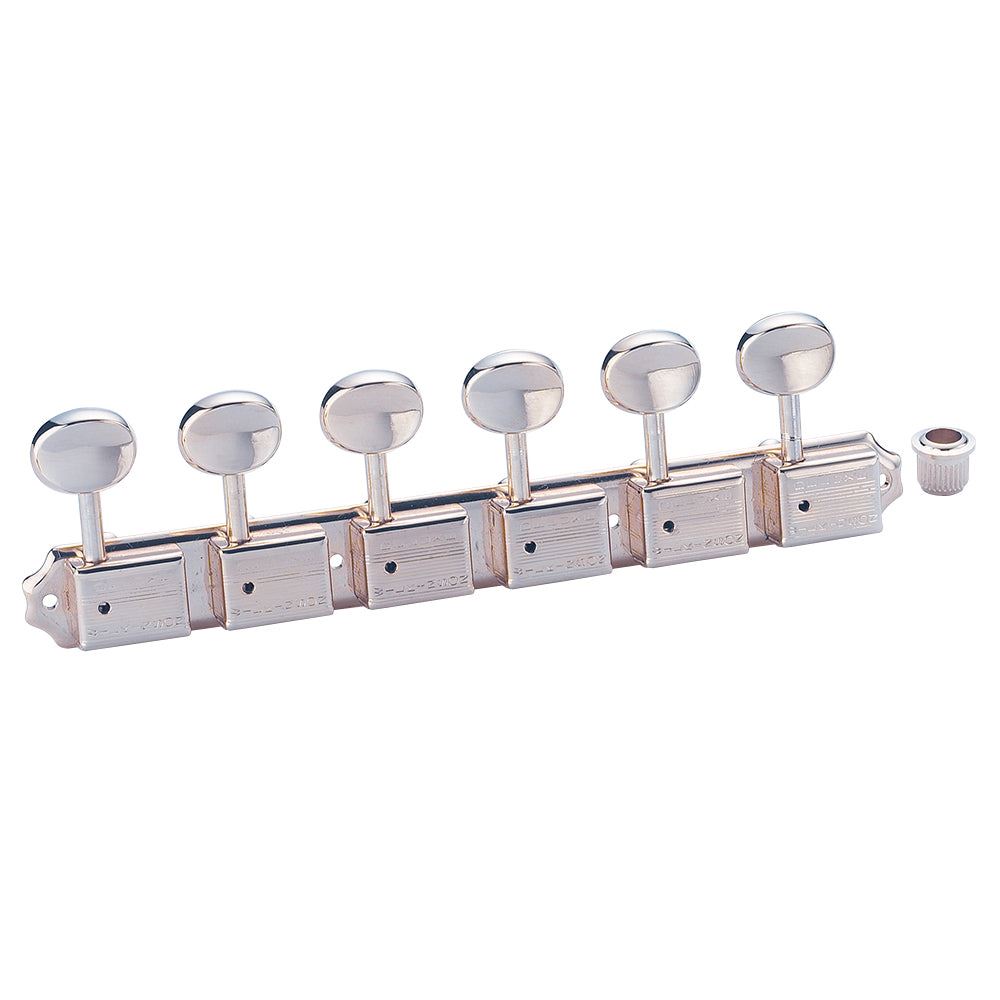 Chrome - Wilkinson Deluxe œ6-on-a-strip in line, with classic mini oval vintage style buttons. E-Z-LOK designed to work on guitars of all styles E-Z-Lok machineheads are the ultimate in the quest for perfect tuning stability.Unlike ordinary tuners, each E-Z-Lok post has two holes. This simple concept transforms each tuner into the tuner you want it to be. Want to string conventionally?Then OK, do it! Want to change the tension over the nut? OK, use the upper hole to decrease the tension, use the lower hole to increase the tension.Want to stay in tune when using a Vibrato/Tremolo system? Then OK, you can do this too. Eliminating the wraps around a tuner post is a must do when using a vibrato system. Thread the string through either the top or bottom hole, pull the string tight and make a wrap around the post then thread the remaining string through the second hole. Pull tight again and you now have a locking tuning key.