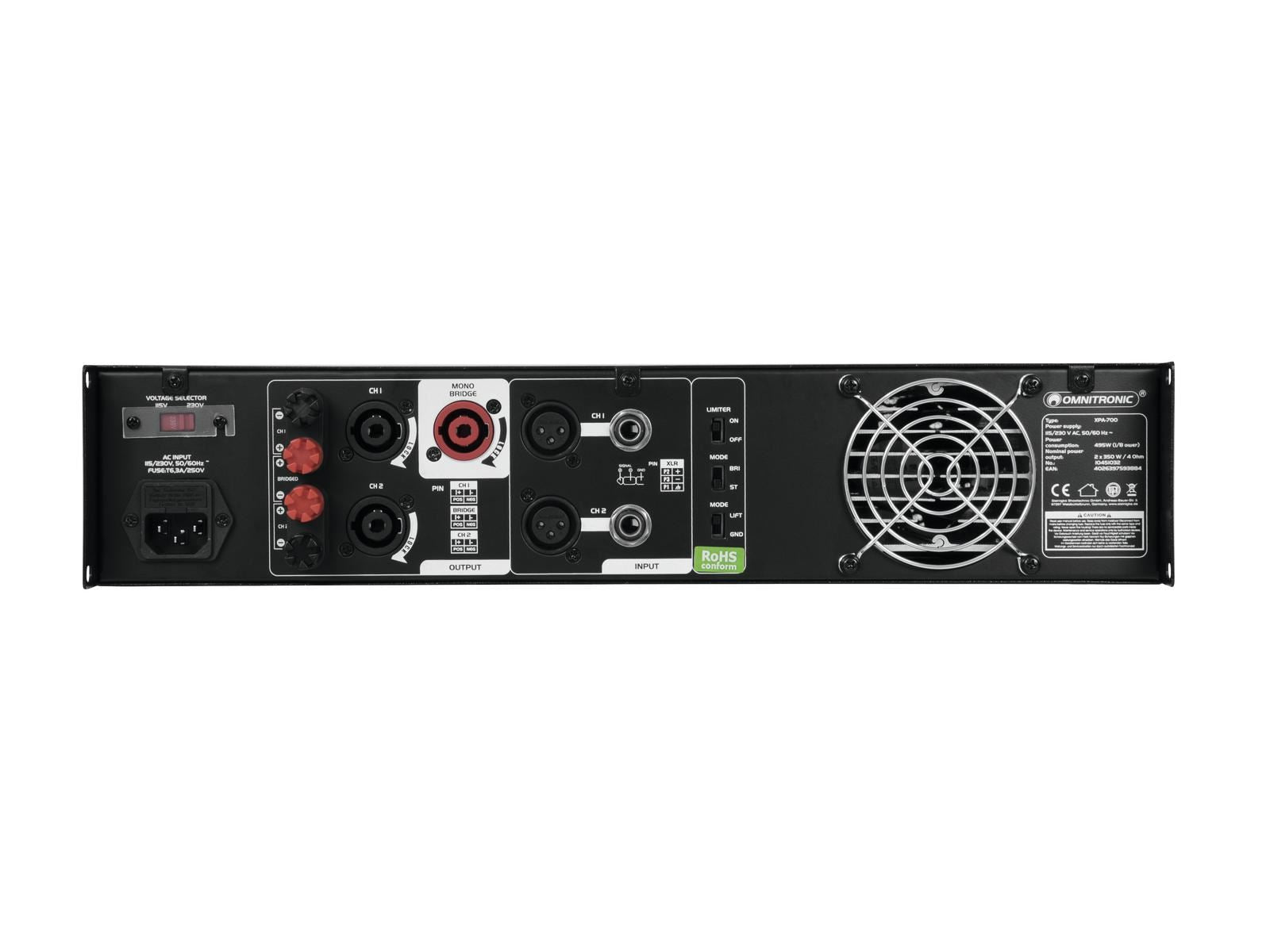 PA-Verstärker mit integriertem Limiter, 2 x 350 W / 4 Ohm, 2 x 240 W / 8 Ohm