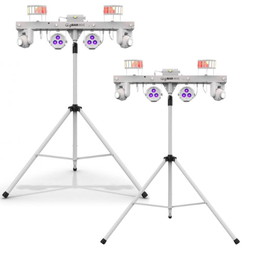 Montés au-dessus du GigBAR Move, vous trouverez deux luminaires derby et un puissant laser avec des diodes rouges et vertes. Ils sont idéaux pour remplir de grandes surfaces avec des effets accrocheurs, ajoutant encore plus de dynamique et de mouvement à votre spectacle. Et puis il y a le bar lui-même. Celui-ci est équipé de quatre LED bicolores ultra lumineuses (blanc + UV) pour créer cet effet stroboscopique fascinant. Parfait pour des effets éblouissants et énergiques. Et mieux encore, tous ces effets fonctionnent ensemble en harmonie, créant une solution d'éclairage puissante que vous pouvez installer et démonter en quelques minutes.