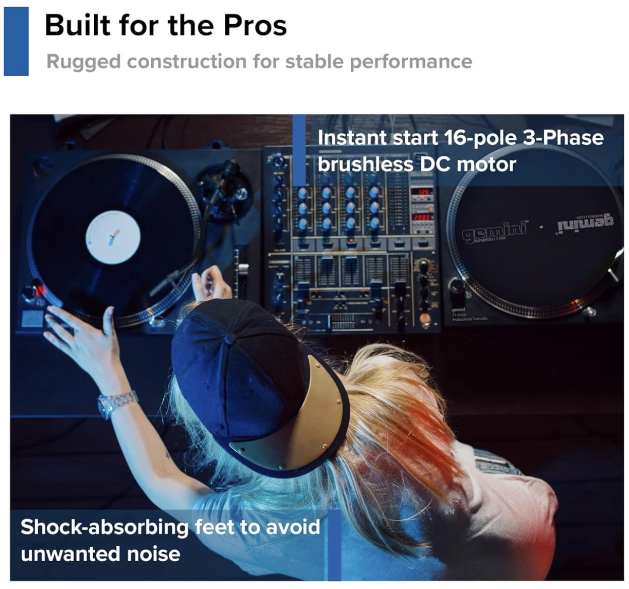 Gemini TT-5000 Professional Direct-Drive Turntable with USB Recording. The Gemini TT-5000 high torque direct-drive turntable features a redesigned chassis with reinforced housing construction. The TT-5000 uses a precision-engineered die-cast aluminum platter for stable rotation. It is ideal for DJs, audiophiles, and casual listeners alike. The 16-pole 3-phase brushless DC motor powers the TT-5000 direct-drive motor to instant start. The TT-5000 has precision pitch control of plus or minus 10 percent. The turntable offers 33 1/3, 45, and 78 RPM speed options. A statically balanced S-shaped tonearm features a hydraulic lift and an anti-skate mechanism. A Gemini HDCN-15 headshell and cartridge with Audio Technica elliptical stylus is included. What sets this record player apart is its high-resolution USB connection, which enables you to record and digitize your vinyl collection with ease. It also includes a built-in phono preamp with switchable RCA phono or line output.