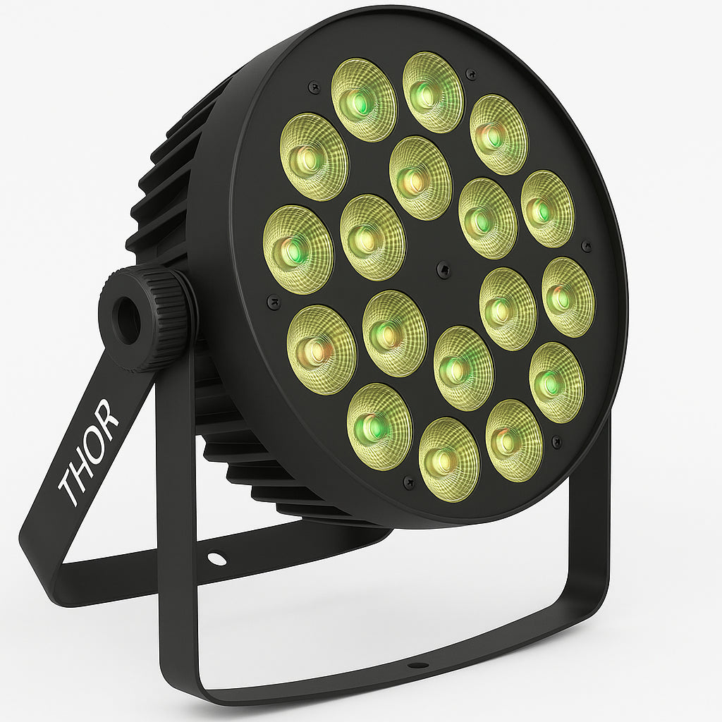 The Thor MaxPar Quad RGBW LED Par Can is a compact yet highly functional DMX Flat Par Can specifically designed to offer exceptional Stage Wash Lighting effects for live performances, venues, and mobile DJs. Featuring 18 ultra-bright 4W RGBW LEDs, it provides smooth colour mixing possibilities along with practical preset programs. Its slender design makes placement simple in tight spots, especially trusses, while the inbuilt control panel allows easy selection of static colours, auto changing modes and sound active mode.