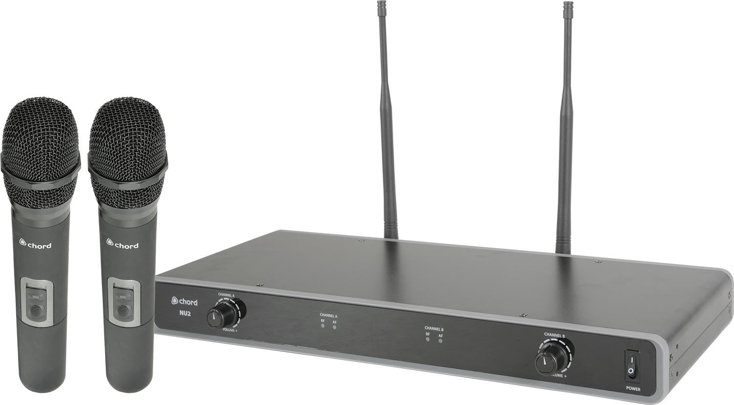 Système de microphone sans fil double avec récepteur UHF fixe et 2 émetteurs portables. Le récepteur est compatible avec les racks standard de 19 pouces grâce aux oreilles de rack incluses et aux accessoires d'antenne de montage avant.