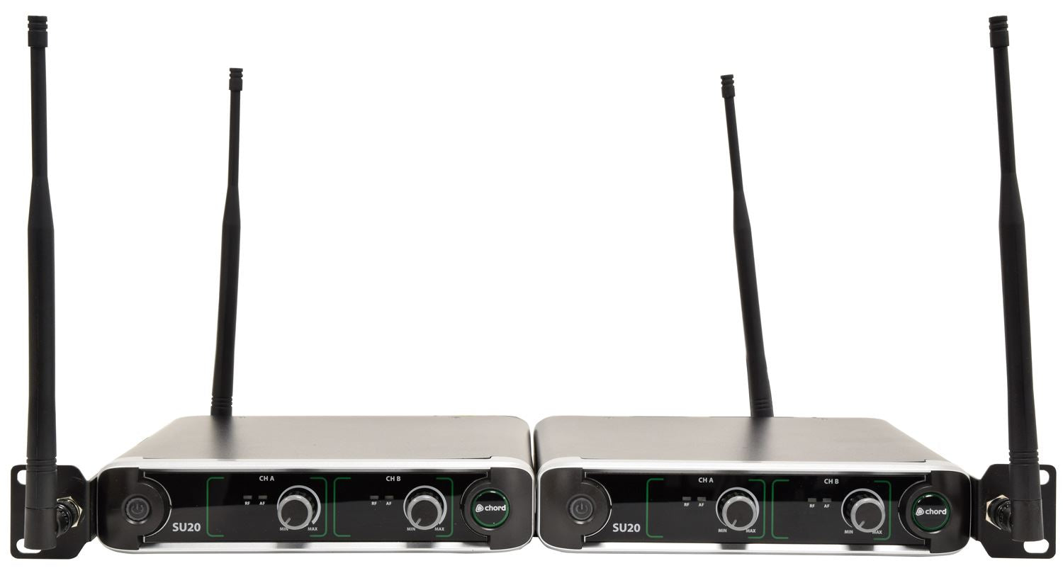 Système de microphone sans fil UHF double avec un récepteur compact, fourni avec le matériel pour le montage de 1 ou 2 unités dans un espace rack 1U 19". Des câbles BNC et des antennes amovibles sont fournis pour un montage arrière ou avant selon les besoins. Chaque émetteur est alimenté par 2 x AA Les piles et la version ceinture sont fournies avec des microphones tour de cou et micro-cravate. La sortie est fournie individuellement sur des connecteurs XLR symétriques ou mélangée à une seule prise jack 6,3 mm. Offrant toutes les fonctionnalités d'un système double UHF dans un format demi-rack compact.
